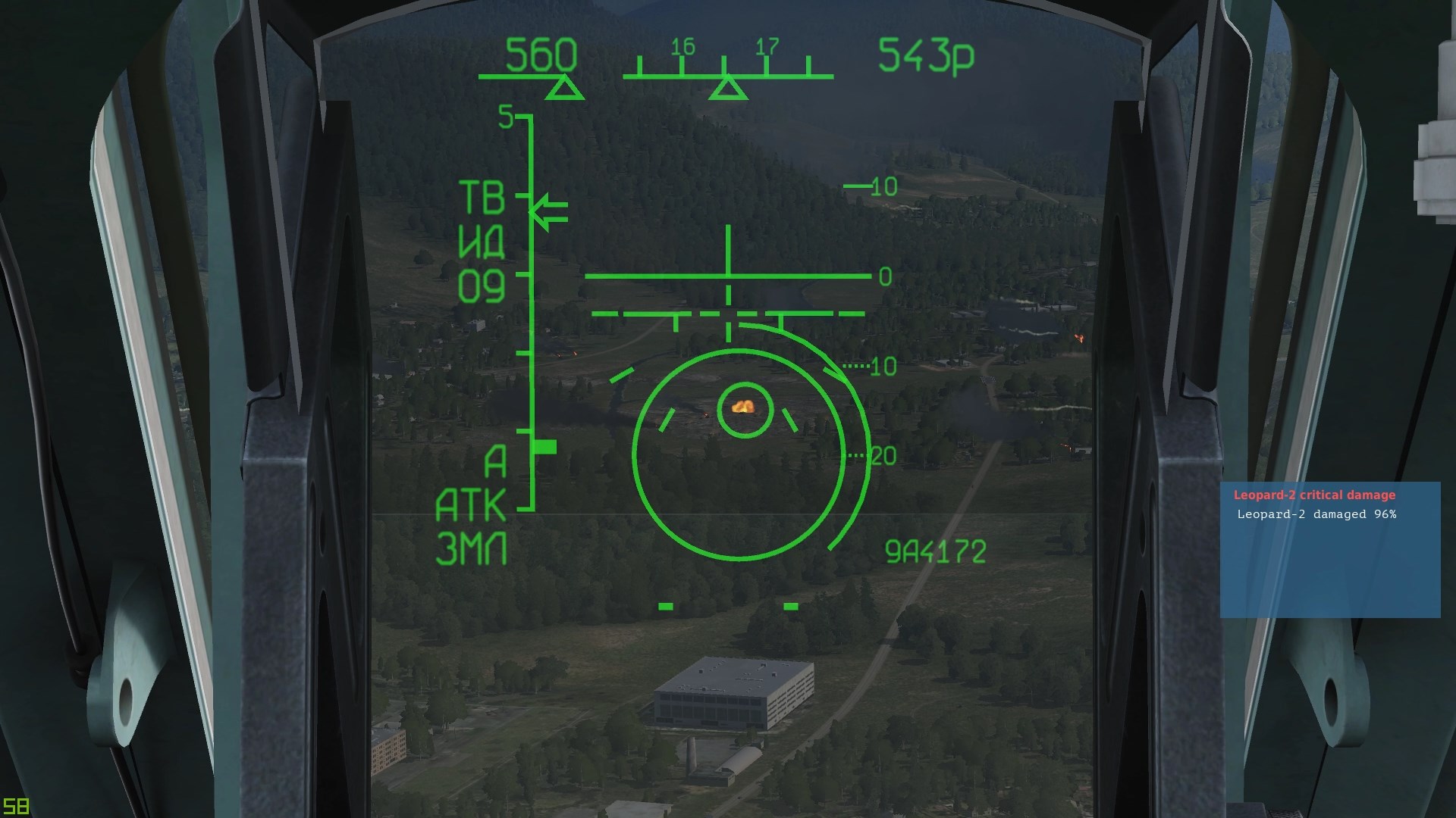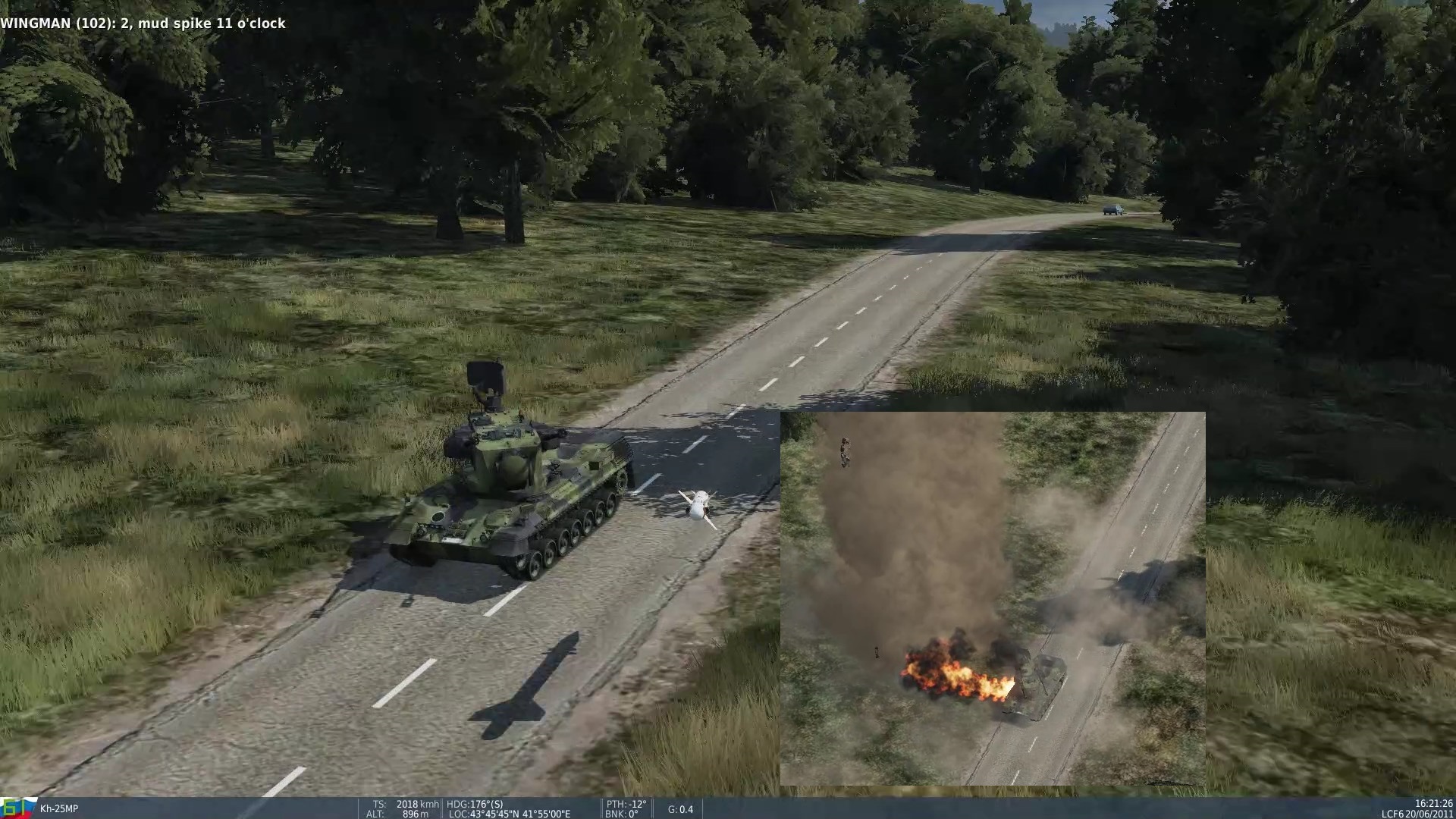 Z dwóch wystrzelonych rakiet anty-radarowych Kh-25MP pierwsza nie trafia bezpośrednio w cel (zasłonięty częściowo drzewami), ale wystarczająco blisko...