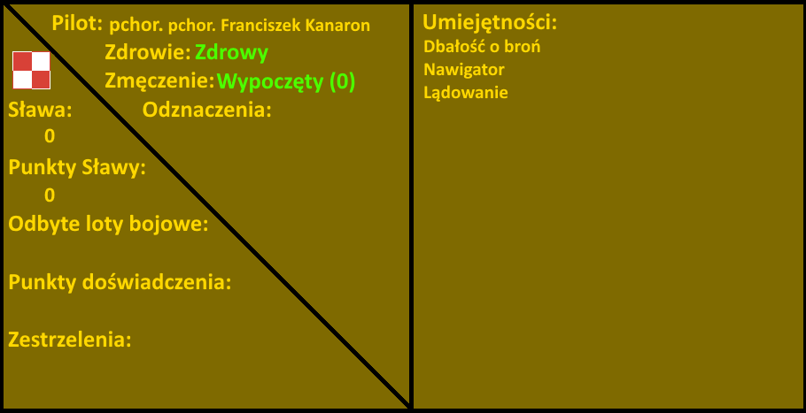 sierż. Leopold Flanek, (NPC) skrzydłowy Stanisława Żwirko - Zdrowy, zmęczenie 1 (wypoczęty) - EXP 4/4 - Zestrzelenia: 1 Ju87, 1 Do17, 1 Bf109, Me110 (prawdopodobne)