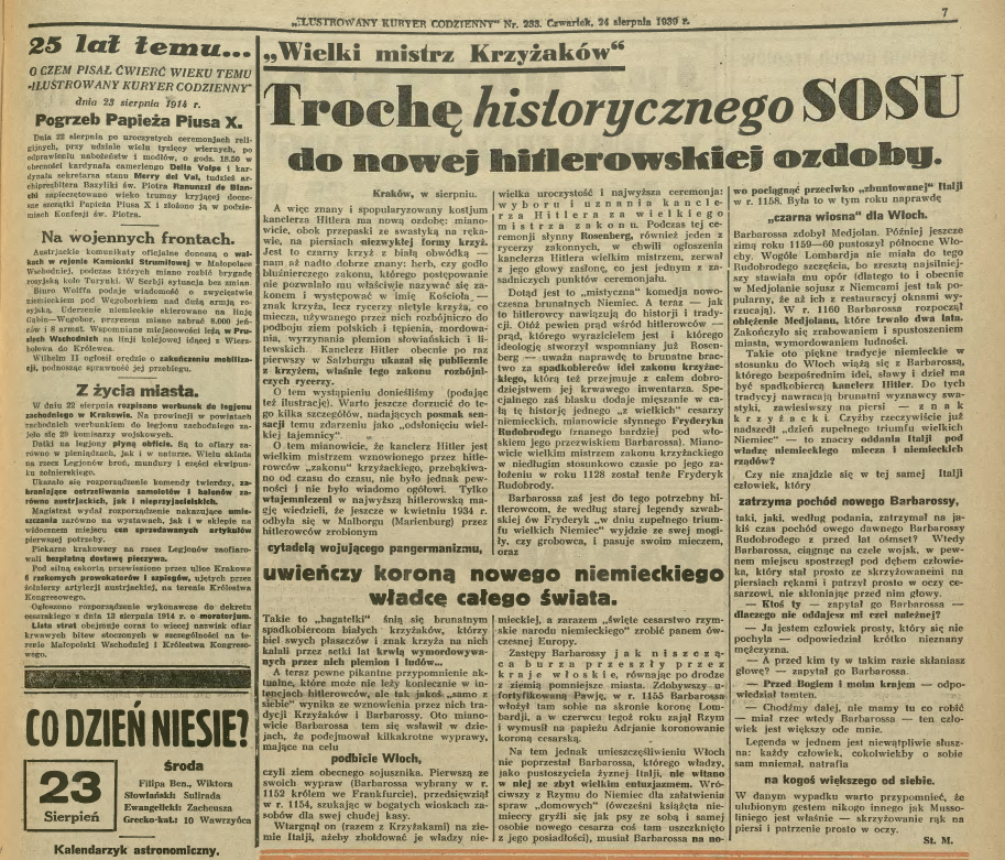 Gdy 23 sierpnia Stanisław opuszczał swoje mieszkanie i przekraczał planty przy leniwie wschodzącym słońcu, zastawiając się, czy w niedzielę będzie równie słonecznie. Nie wiedział jeszcze, że ten dzień miał wywrócić wszystko do góry nogami i o spokojnym spacerze po plantach w niedzielę będzie mógł wspominać. Teraz jednak, pomimo coraz bardziej alarmującej sytuacji, wydawało się, że taki stan może trwać i trwać. Mijając gazeciarza Stanisław zakupił gazetę i jadąc tramwajem do lotniska spojrzał, co podali w nagłówkach. Wszyscy zachodzili w głowę, co wyprawiają Niemcy. Zwłaszcza Japonię, toczącą przecież wojnę z ZSRR musiało wściekać ostatnie posunięcie Hitlera. Na 7 stronie znów rozpisywano się o tym, jak się ma propaganda Hiterlowców do faktów historycznych.