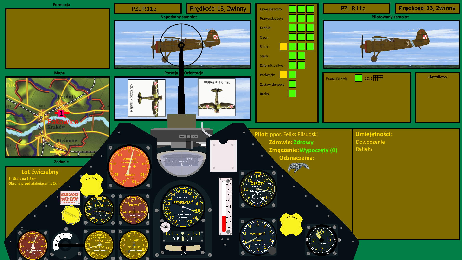 Zbliżała się 10:00, gdy Grot 5 wystartował z Krakowskiego lotniska, kierując się na Olkusz, gdzie teraz powinien już walczyć ppor. Żwirko. Lot przebiegał bez żadnych przeszkód, widoczność była wspaniała. W radio słyszał, jak meldowano o opuszczeniu obszaru przez samoloty-cele dla Stanisława oraz wreszcie o opuszczeniu obszaru przez samego walczącego, a po dłuższej chwili, gdy Grot 5 kręcił się nad Olkuszem zameldowano, że wszystko gotowe do przyjęcia następnego samolotu, co potwierdzili też piloci z 23 eskadry, których wkrótce dostrzegł. Dwa samoloty RWD-8 zbliżały się do pustyni, a jeden z nich ciągnął za sobą rękaw-cel. Feliks otworzył przepustnicę i wsłuchując się w ten miły dla ucha dźwięk pracujących silników zbliżył się do samolotów, gdy te nadciągały nad pustynię Błędowską. Wszystkie 3 samoloty przeleciały granicę pustyni, a Feliks wziął na cel rękaw. Nie było potrzeby przestrzeliwać KMów. Jak zatną się podczas pierwszego ataku, będzie to miało dokładnie taki sam efekt, jakby zacięły się teraz, a kule z przestrzelenia nigdy nie były brane pod uwagę. Żałował, że eskadra nie stacjonowała w Warszawie. Może pozwolono by mu wziąć na te ćwiczenia prototypowego Wilka, aby mógł pokazać, że taka maszyna lepiej spełni stawiane teraz zadania. Teraz jednak miał rękaw do zestrzelenia i dwa podejścia... może trzy. Trzy dobre serie powinny wystarczyć, aby kapitan uznał rękaw za zestrzelony, choć wskazane było umieszczenie czwartej dla pewności... Feliks skupił się przed otwarciem ognia, gdy rękaw rósł w celowniku.