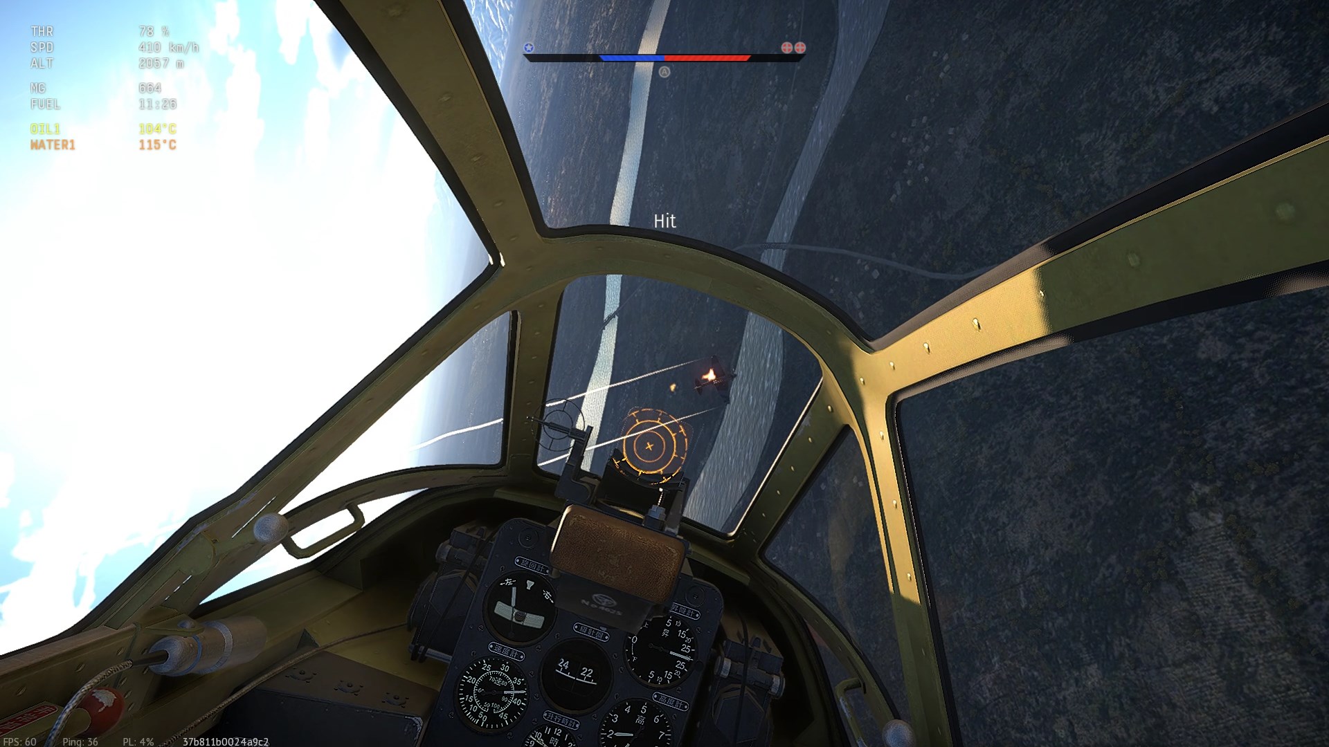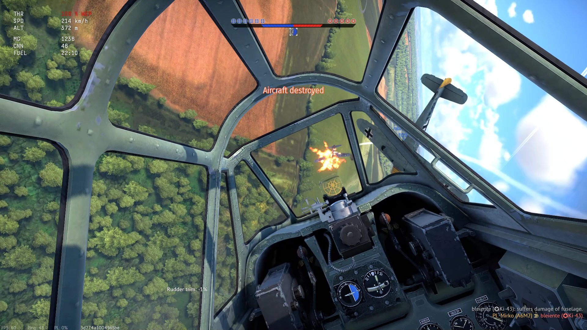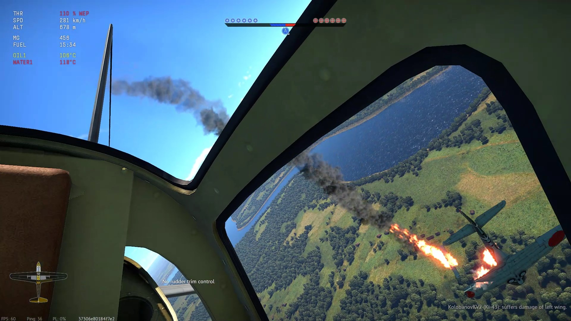 Został trafiony przeze mnie prawdopodobnie w "zadek" z "cienkich". Napis "Hit", (3:07), rozbłysk na stateczniku pionowym i dwa obłoczki dymu.