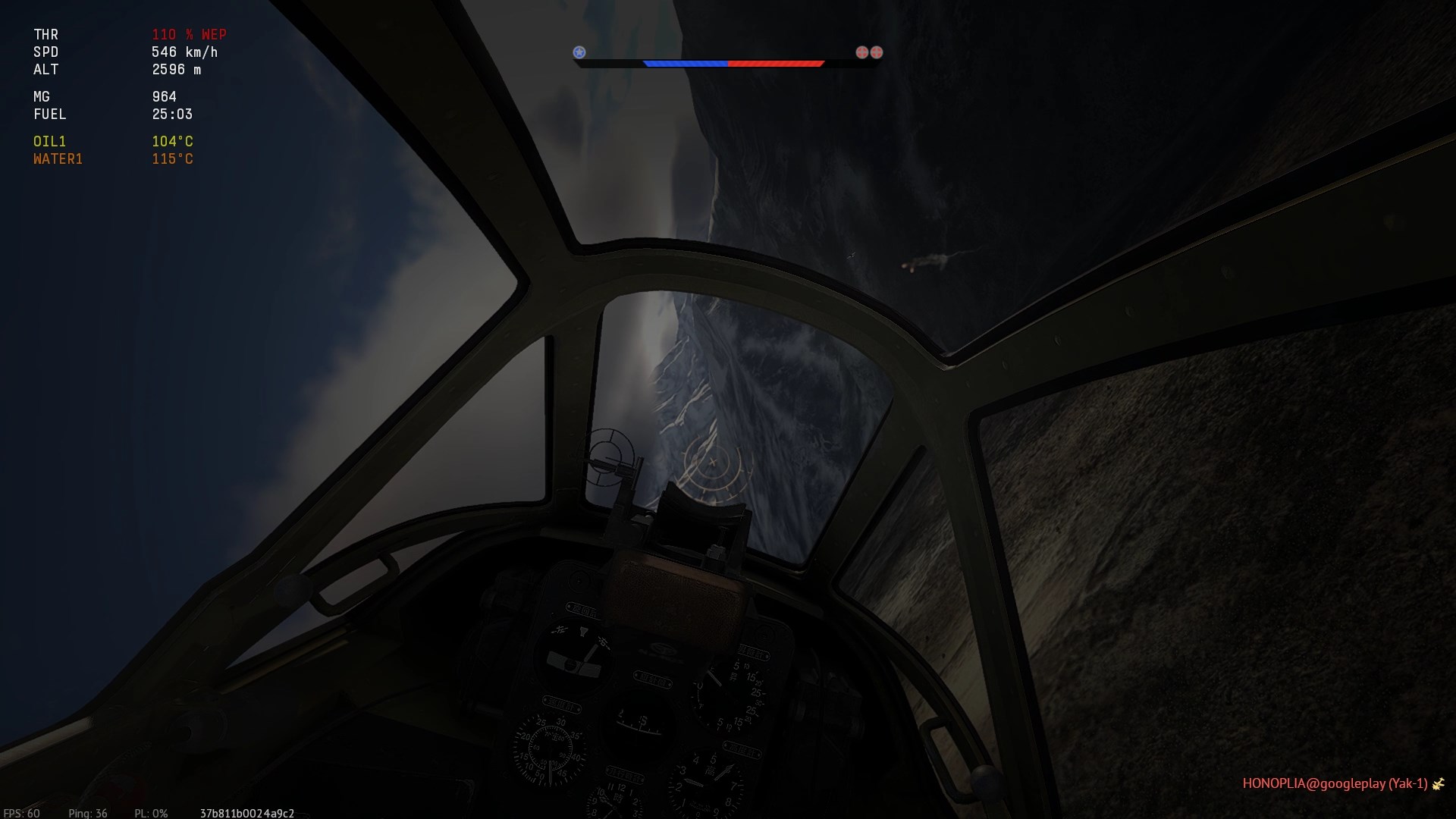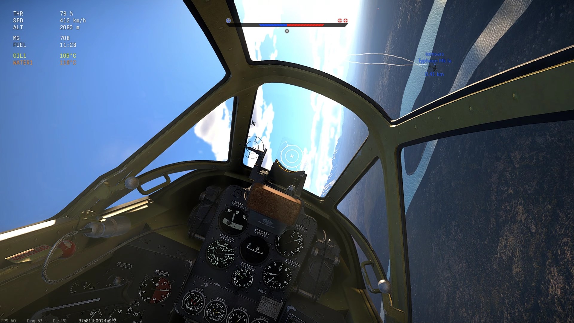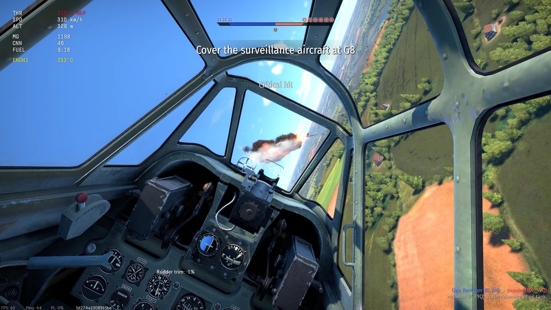 Został trafiony przeze mnie prawdopodobnie w "zadek" z "cienkich". Napis "Hit", (3:07), rozbłysk na stateczniku pionowym i dwa obłoczki dymu.