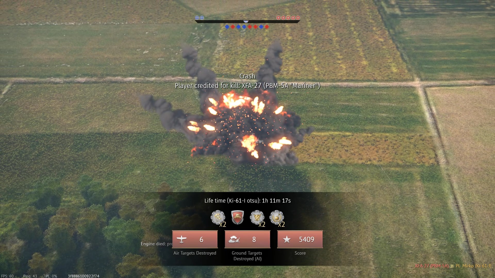 Później krwi napsuli mi gracze w Dornierach oraz gracz w Ki-44, który zaskoczył mnie 2x. Na koniec jednak zemściłem się na nim - ostatnie dwa fragi i remis.