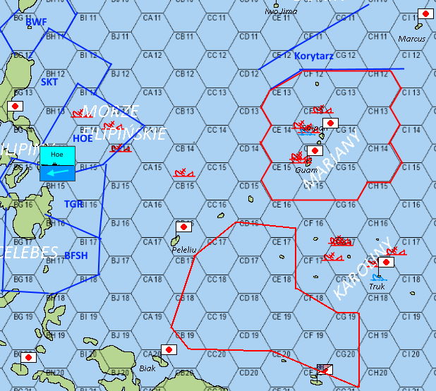 - Jak na moje oko, poruczniku, to wygląda mi na to, że nasza niebieska krecha na północy wyraźnie wbija się w ląd Samar, pozostawiając cieśninę San Bernardino, oddzielającą Samar od Luzonu w obszarze działania "SKT", a na południu wyraźnie wbija się w Leyte, zostawiając cieśniny rozdzielające Leyte od Mindanao na pastwę torped "TGR". Więc raczej nie zbliżałbym się zbytnio w rejony cieśnin na północy ani na południu naszego rejonu, aby nie oberwać torpedą od któregoś z kumpli, który może tam polować i ciutkę zapędzić się w pogoni za wrogiem.
