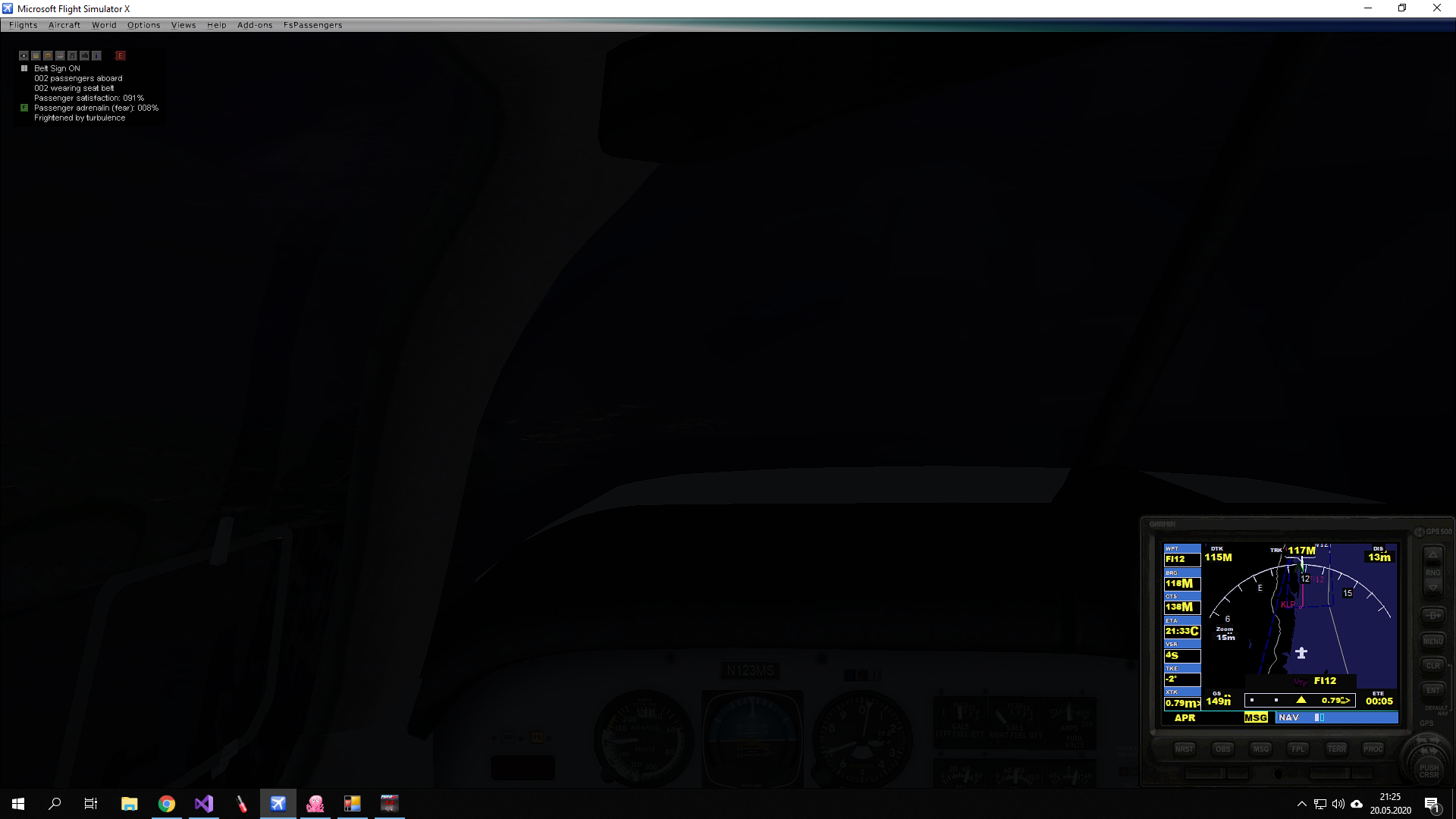 A na zewnątrz ciemno fest, kontynuuję lot na prawym zbiorniku Do tego wiatr, chmury, źle wyważony samolot przez paliwo... Do tego brak tej matrycy jeszcze ze wskaźnikami tak istotnymi jak wysokościomierz, prędkość pionowa i sztuczny horyzont... A że postanowiłem przez takie ładne tereny pilotować cały lot sam, bez autopilota to ta krótka chwila stuknięcia w wskazówkę wystarczyła abym stracił z oczu punkty odniesienia... Wiedziałem, że bez sztucznego horyzontu to może starczy czasu na odmówienie paciorka... No to się wychyliłem znad kokpitu żeby spojrzeć na sztuczny horyzont na monitorze... Troszkę zafundowałem pasażerom delikatne przeciążenia i zawijasy, ale nie na tyle żeby to zauważyli czy odczuli na szczęście. Dość dobrze sobie poradziłem