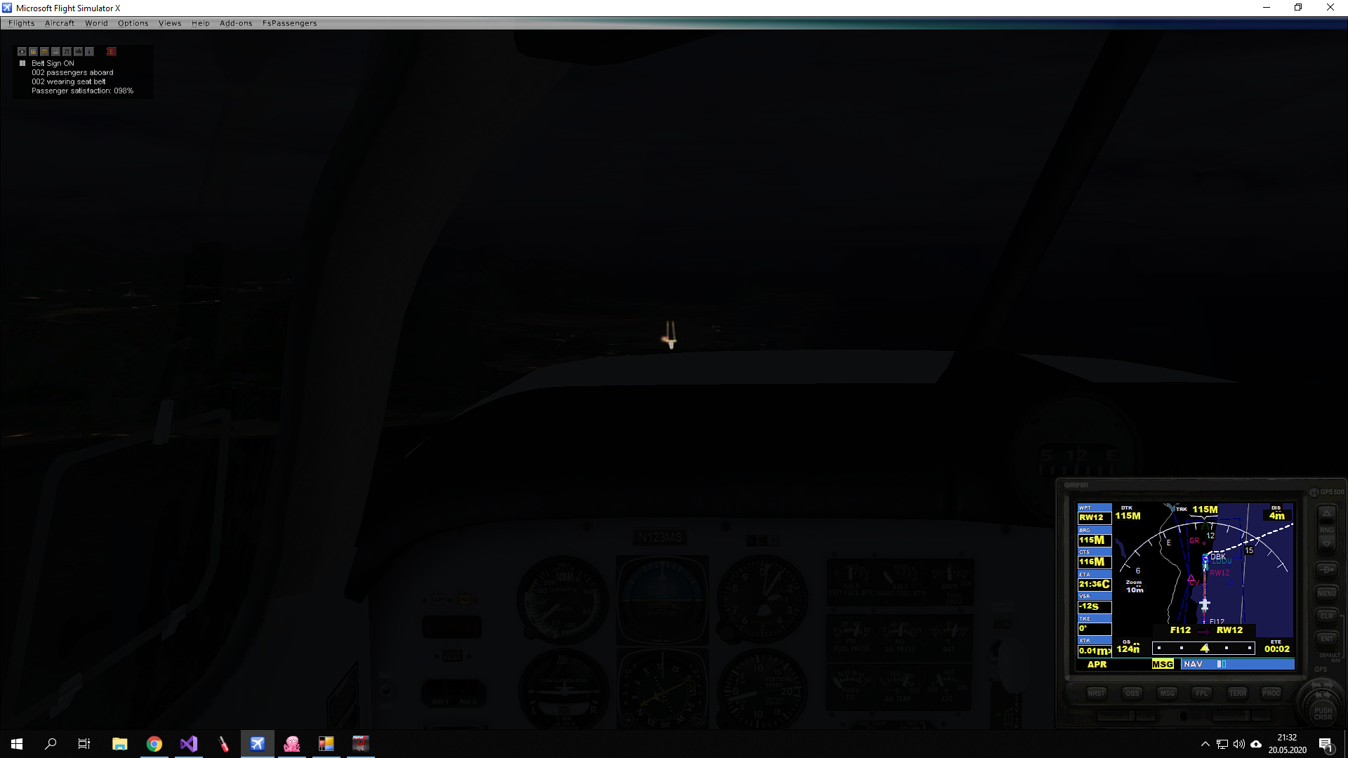Nieco później widać już lotnisko. Pogoda nie była tak ekstremalna jakiej się spodziewałem Trochę znosiło na prawo, ale wylądowałem bezpiecznie i bardzo delikatnie Zjechałem z pasa i kolejny problem... Ciemno dość, nie widzę podpisów przełączników świateł. Zamiast wyłączyć światła lądowania i stroboskopowe to na dosłownie sekundę wyłączyłem przypadkiem światło rotujące, które ma się świecić jak silnik chodzi