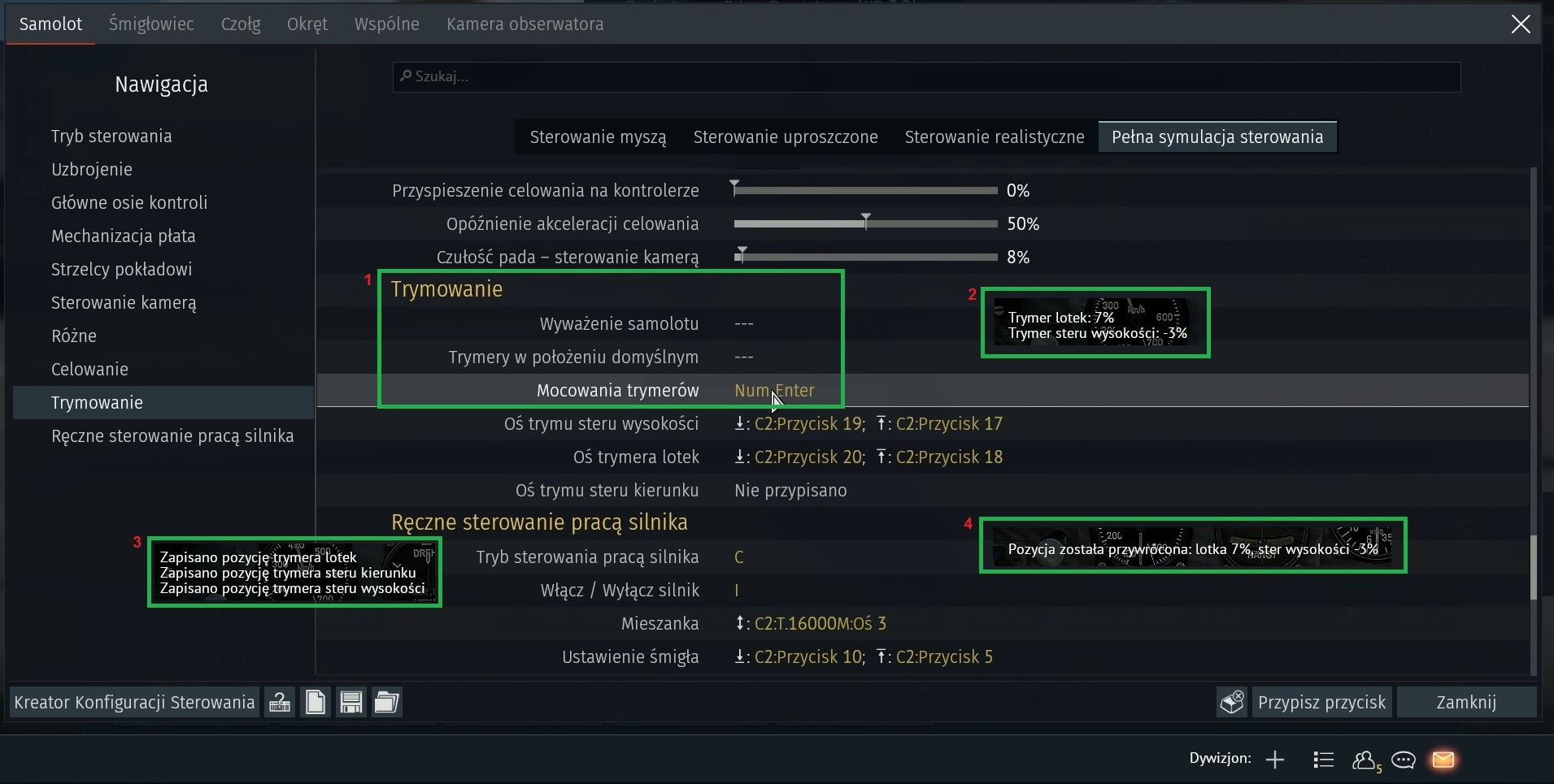 W panelu Sterowanie->Pełna symulacja sterowania->Trymowanie mam ustawione dla opcji Mocowanie trymerów klawisz NumEnter. Dla pozostałych opcji mam wyzerowane przyciski (pole 1 na rys.). Po odpaleniu lotu testowego danym samolotem i osiągnięciu prędkości tzw. przelotowej, ustawieniu przepustnicy np. 88-92%, trymuje samolot (pole 2 na rys.) i naciskam przycisk przypisany czyli NumEnter. Ustawienia trymerów zostają zapisane (pole 3 na rys.).