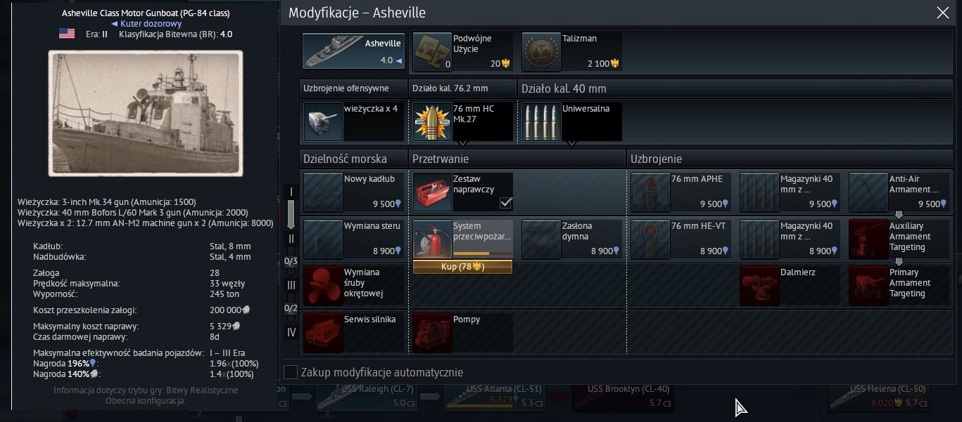 Asheville.... Najdroższa (wraz z krążownikami) jednostka USA.. Uzbrojona w szybkostrzelne działo 3'', 40mm boforsa i kilka karabinów maszynowych.... Wyposażona w radar, ale delikatna jak kuter... Do tego droga w naprawach... Co można zrobić z tym okrętem?! Nawet wymaksowanie go to koszmar... Mimo używania +300%... wciąż zestawu gaśnic na nim nie mam.