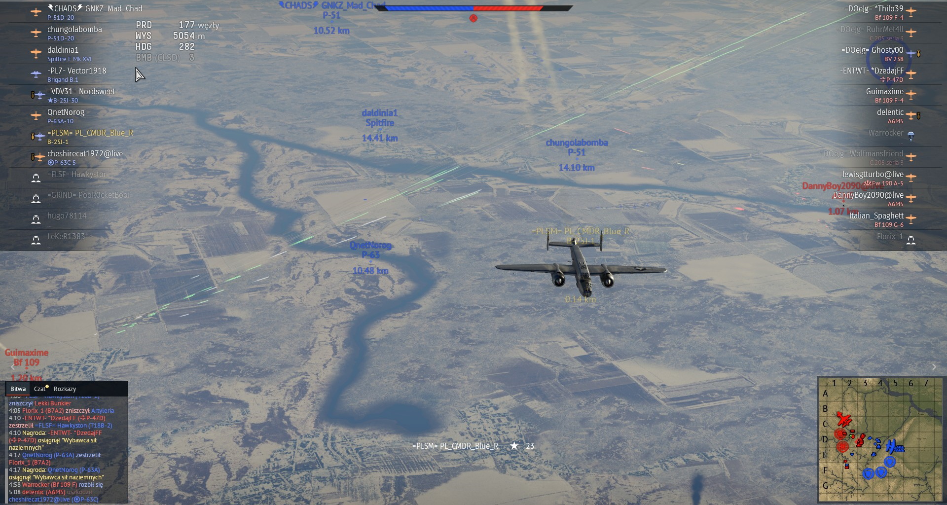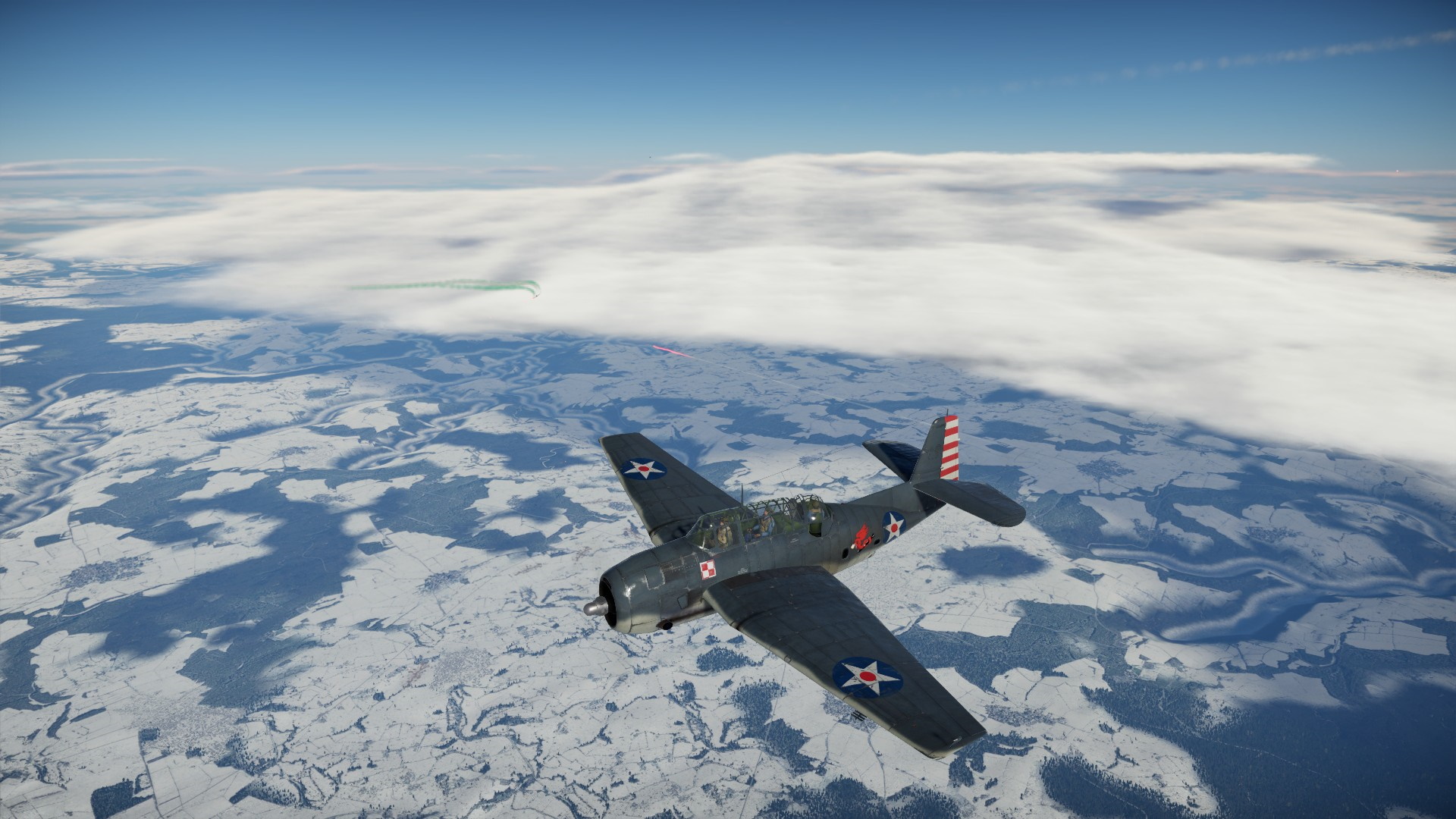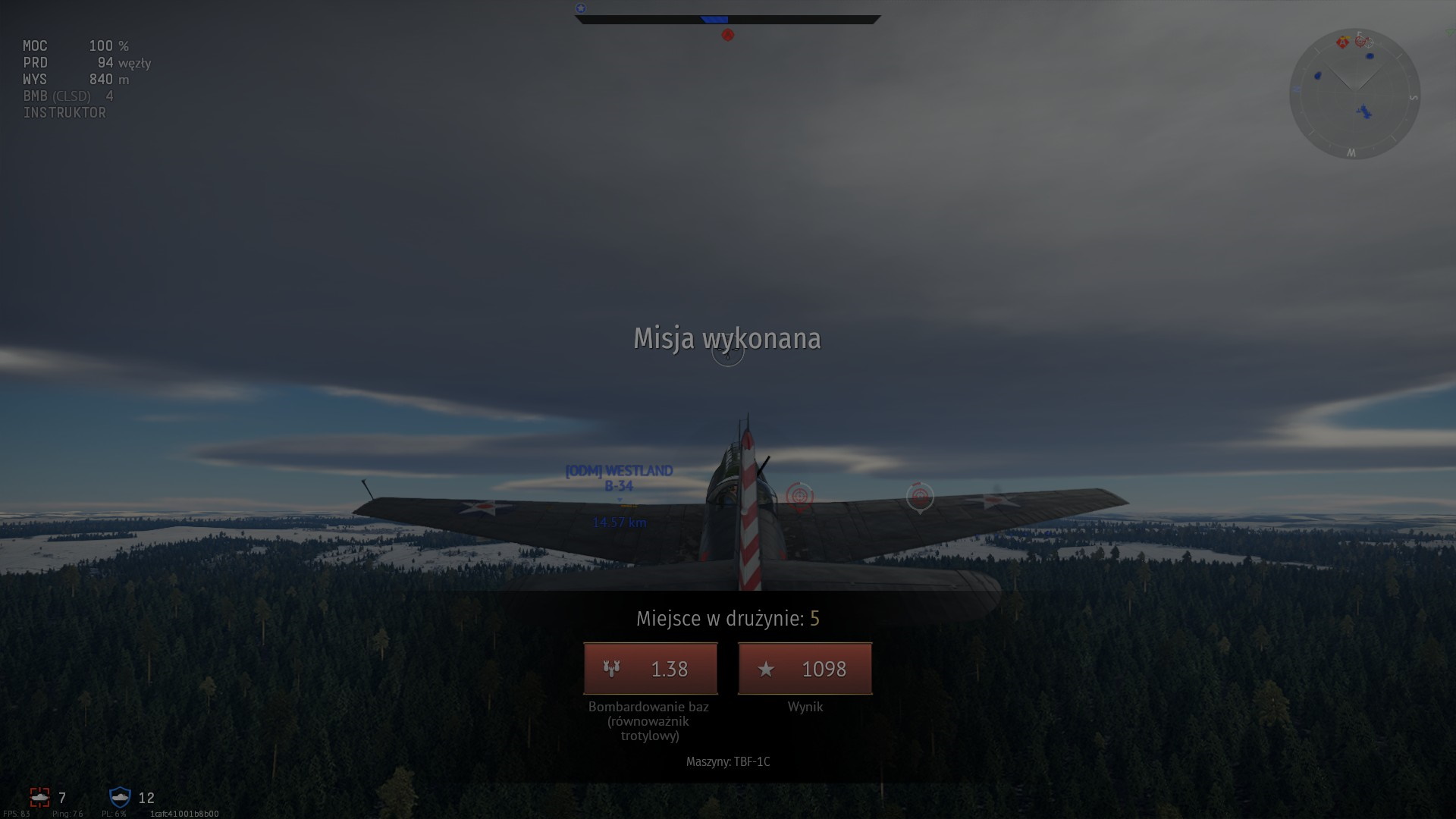 Przewaga prędkości wroga, spowodowała, że na chwilę znalazł się przed nami. Nie mogłem przepuścić tej okazji i zaatakowałem go z KMów, niestety, ociężałość TBF nie pozwoliła na więcej efektu, niż pokazanie wrogowi, że jesteśmy zdeterminowani walczyć.