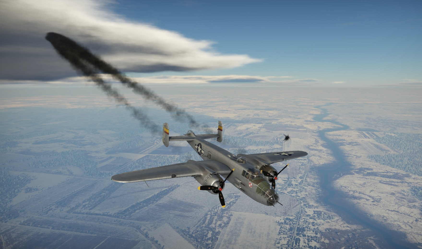 Cały jednak czas inicjatywa była w rękach wroga i większość pocisków jednak lądowała w naszym bombowcu, a konkretniej w silnikach. Pierwszy poddał się prawy silnik, zaczynając się krztusić, wypluwając z siebie warkocz dymu. Przerywał, ale pracował... zaraz potem także i lewy silnik zaczął odmawiać posłuszeństwa i padł jako pierwszy...