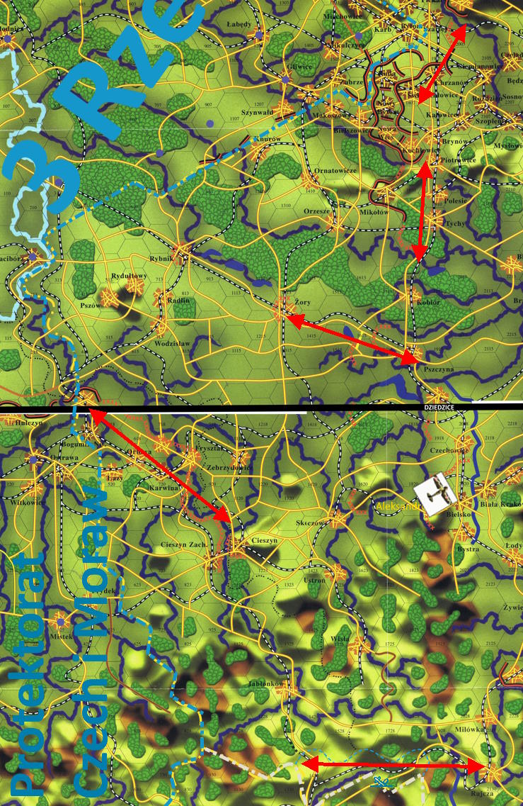 -Klucze, mam potwierdzony samolot zwiadowczy pomiędzy 14-30 (Przełęcz Jabłonkowska) i 21-30 (Rajcza), poniżej chmur. Kolejny między 05-18 (Bogumin) i 11-22 (Cieszyn), następny 13-14 (Żory) -18-15 (Pszczyna) i dwa nad Śląskiem. Znad całego Śląska meldują samoloty zwiadowcze, myśliwskie i bombowe. Już nawet odebrałem prośbę o zbombardowanie nieprzyjaciela pod Skalite. "Kocur", jakiego celu szukamy? Gdzie nie polecisz, są hitlerowskie maszyny.