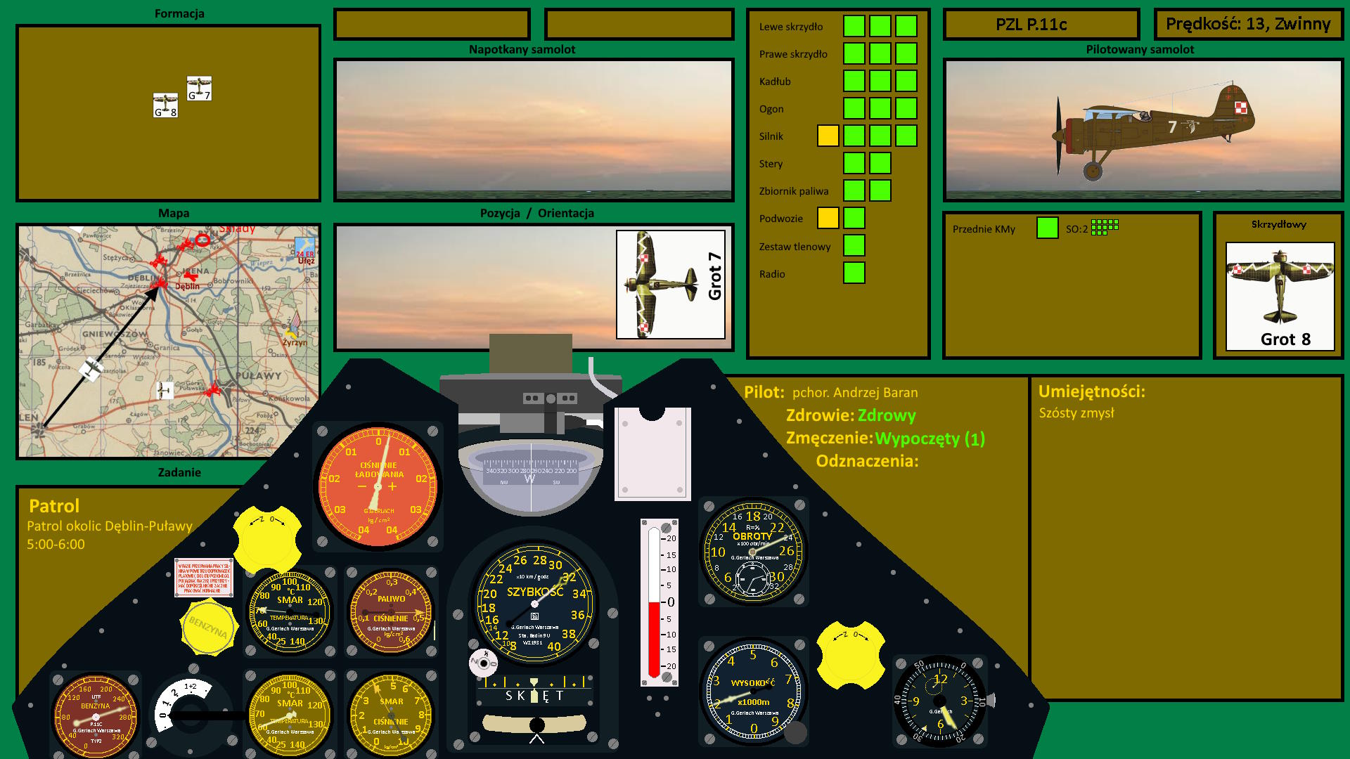 -Andrzej, weźmiesz Janka [Kremskiego] i lecicie na poranny patrol. 122-ga - wskazał na dwie kołujące maszyny - Leci na odcinek Puławy-Sandomierz, Dęblin będzie osłaniać klucz z Ułęża, a wy macie patrolować linię Wisły między Dęblinem, a Puławami. Taka godzinka lotu. Trójkąt Dęblin-Puławy-Zwoleń. Tylko uważajcie nad mostami. Są tam działa przeciwlotnicze i nie chciałbym, aby was postrzelili. Najlepiej lećcie pomiędzy mostami... W razie zauważenia wroga, zgodnie z regulaminem. Zgrupowania zgłaszacie i podrywamy inne maszyny, pojedyncze maszyny zestrzeliwać bez przeszkód. Wszystko jasne?
