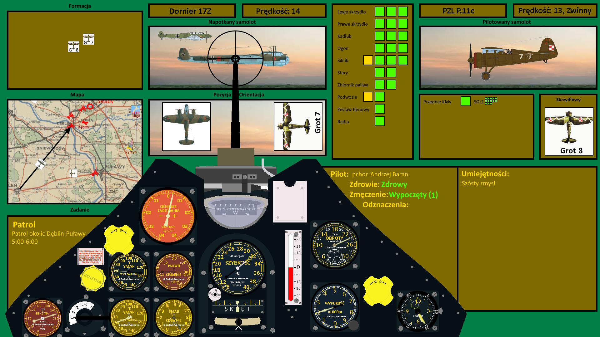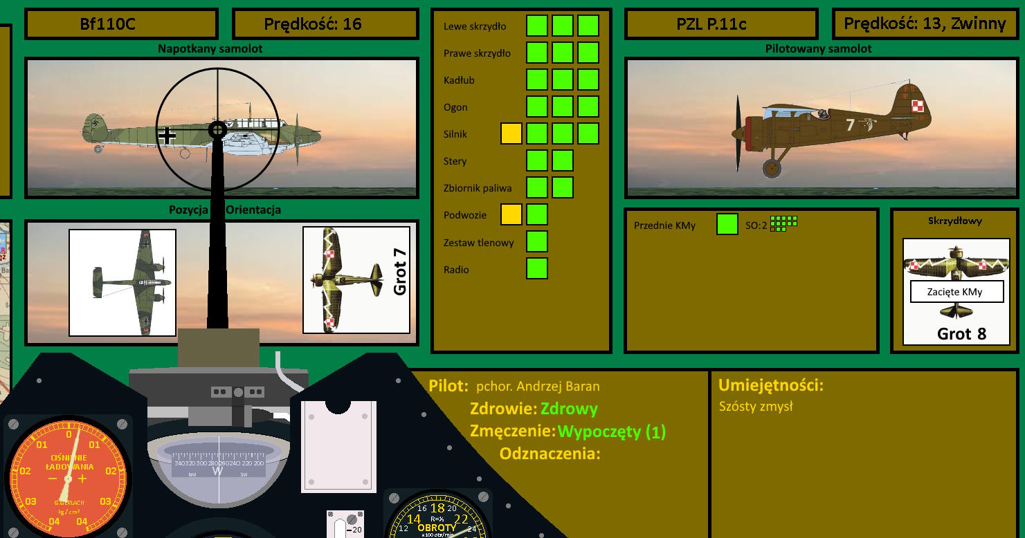 Nie było dobrze, a robiło się jeszcz egorzej. To znaczyło, że Andrzej jako jedyny mógł toczyć bój, a wrogi myśliwiec obniżał lot, rozpoczynając pościg za polskimi maszynami. Pozostawało pytanie, czy odważy się na zejście bardzo nisko, gdzie ociężałość ciężkiego myśliwca mogła stanowić przeszkodę... Niemniej jak się odważy, może szybko dogonić lekkie myśliwce. Z drugiej strony Andrzej mógł wykonać pół pętli i wyjść naprzeciw ścigającej ich maszyny, która dopiero nabierała prędkości.......