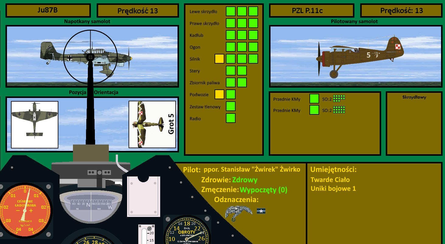 Żwirek dostrzegł, jak pociski trafiają w kadłub wrogiej maszyny w okolicach kabiny, a w ułamku sekundy zorientował się, że nikt do niego nie strzelał... Czyżby Adolfiki nie spodziewały się, że jednak zaatakuje z takiej pozycji? Jednak po otwarciu ognia przez Stasia na pewno zorientują się o pomyłce. Mógł im teraz zejść z pola ostrzału i spróbować podejść nietknięty raz jeszcze... tylko, czy wystarczy mu mocy, aby to zrobić?