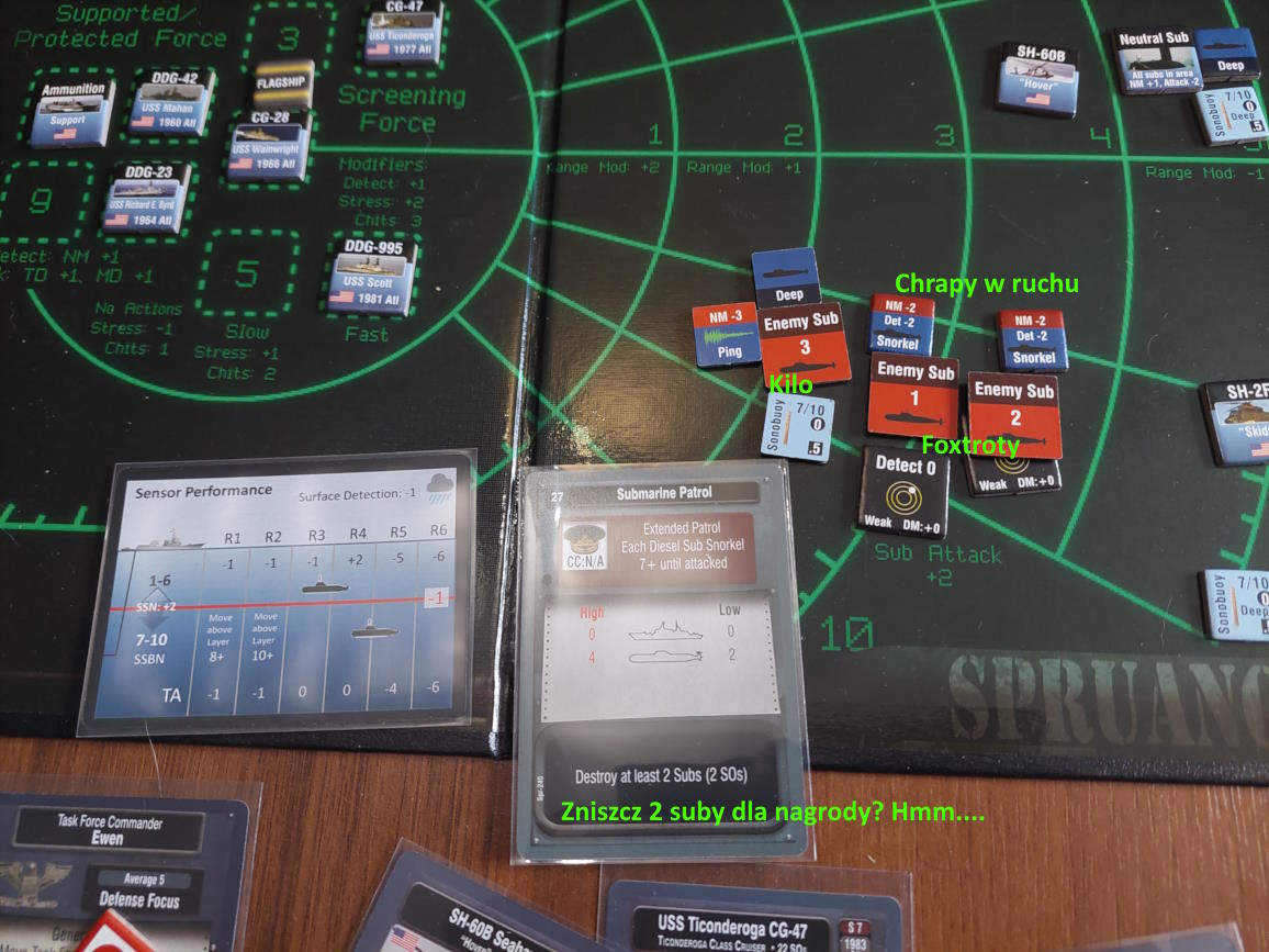 Szczęśliwie po wykryciu nieprzyjaciela, nasze śmigłowce wychwyciły miejsca, gdzie zgrupowały się okręty podwodne... Złapaliśmy wroga, gdy ten ładował baterie... Szczęśliwie naprzeciw nas stały tylko starsze, konwencjonalne okręty podwodne...
