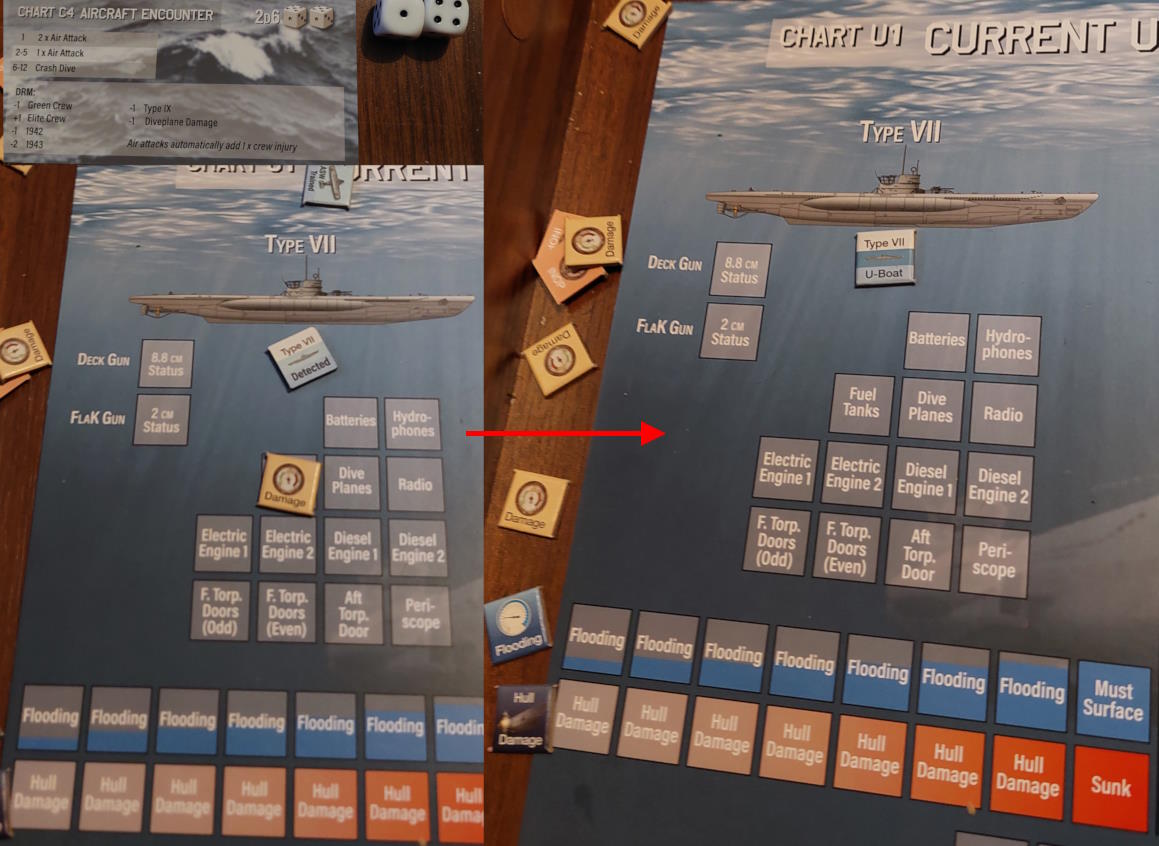 Za dnia samoloty odnalazły tego U-Boota i zrzuciły na niego bomby. Uszkodzony U-Boot musiał zawrócić do Francji.