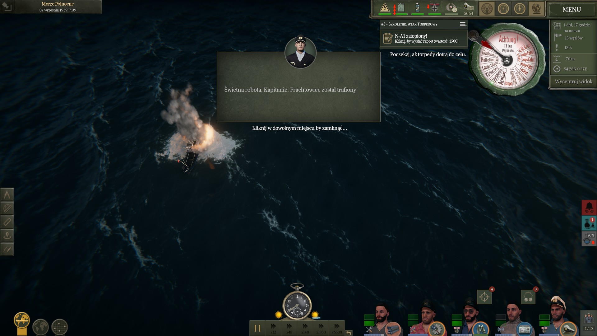 Jeszcze tego samego dnia wypłynęliśmy na pierwszy patrol. Ze względu na nieskończone szkolenie, na pokład przydzielono drugiego kapitana, który miał pomóc w w szybszym osiągnięciu gotowości bojowej [patrol z samouczka, dop. Finka]