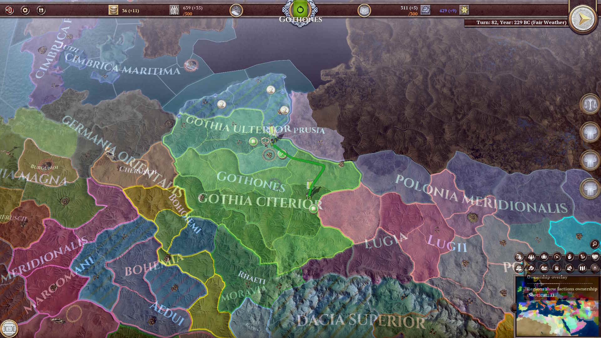 Lecz łaską bogów obdarzony, nie czas jeszcze mu Gotlandię opuścić: książę Clodio powiódł wojów na Prusinów, Elbingus włączając do Gotlandii rejonów. Wieści o kolejnych ziemiach Prusinów gdzieś na wschodzie mówiące, Makovia ją zwące, dla nas jednak ziemię nieznaną będąca. Wiejskie bajania o smokach z bagien wychodzących prawdy nie mówią, lecz może przyszłość i kupce z handlem wiedzę przyniosą.