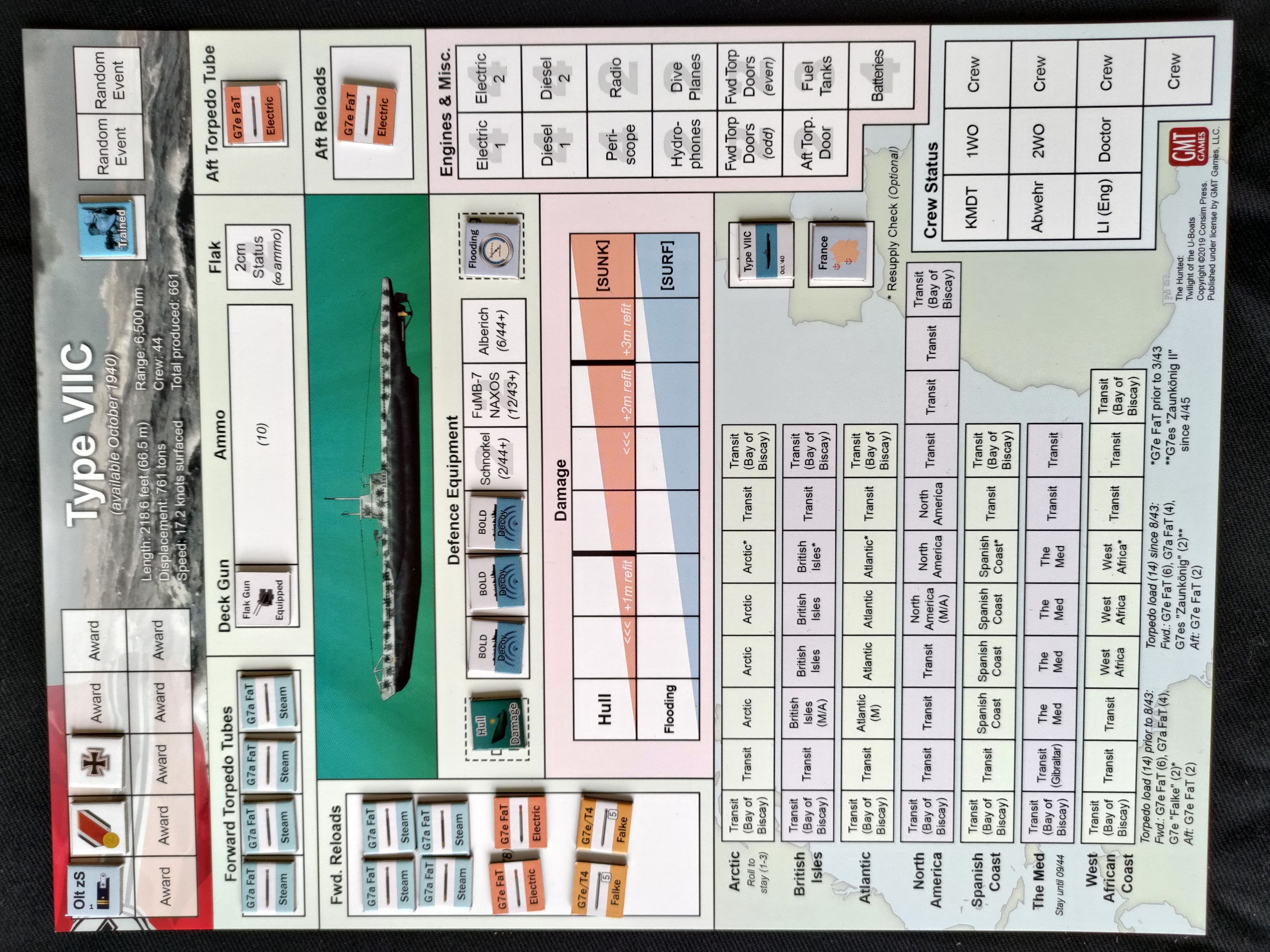 Czwarty obszar patrolowania; zaskakuje nas wrogi samolot. Alarmowe zanurzenie. Zostalismy jednak uszkodzeni i jeden członek załogi jest ciężko ranny. Sprawdzam rzutami kostek jakie mam uszkodzenia: jeden punkt na kadłub i jeden punkt w silnik diesla nr 2. Po ustaniu zagrożenia wynurzamy sie i mechanik probuje naprawić silnik. Rzut kości jest niepomyślny, silnika nie da sie naprawić. Z niesprawnym jednym dieslem będe wracał wolniej i musze dwukrotnie sprawdzac obecnośc wroga w sektorach tranzytowych.