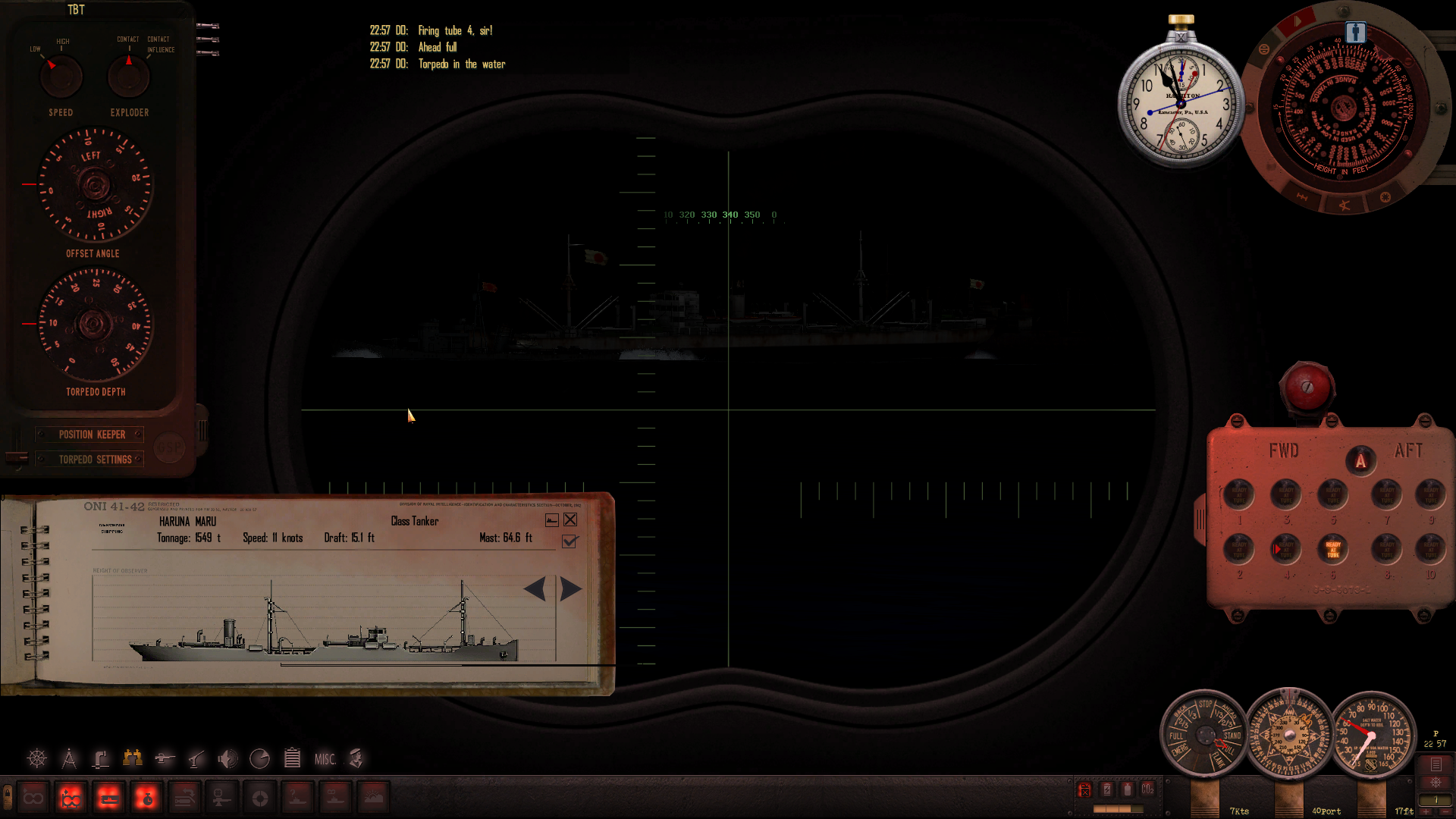 - Haruna Maru, 50 stopni sterburta, 2600 yardów, prędkość 10, - ognia! Druga torpeda, prędkość 12, ognia!
