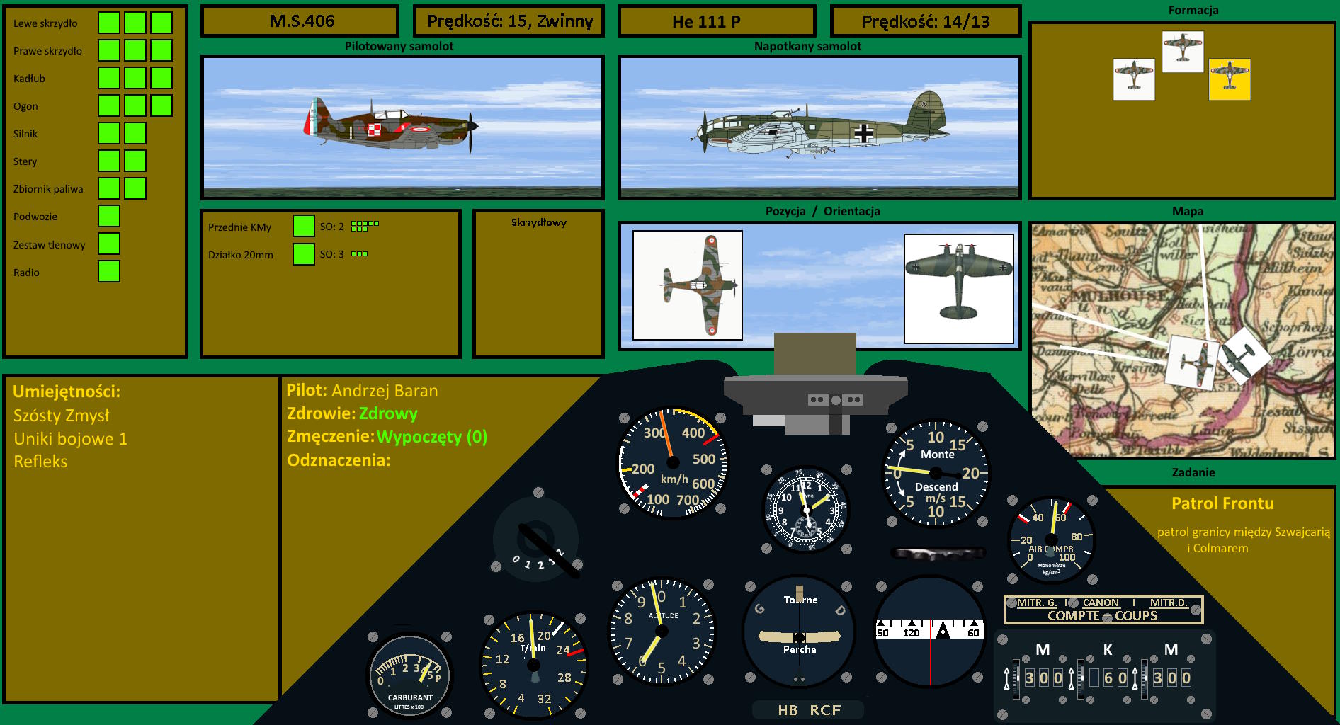 Czekając na dyżurze mogli tylko zanudzić się na śmierć, dlatego z radością powitali wiadomość o gotowości na start. Wystartowali nawet minutę przed czasem i już przed 11:00 wlatywali nad Belfort, lecąc na wysokości 5500 metrów i powoli się wznosząc. Lecieli w trójkątnym szyku. Prowadził porucznik Goethel, po jego lewej stronie leciał kapral Nowakiewicz, a Andrzej po prawej stronie. Na południu chmury delikatnie opierały się o Alpy, a przed nimi w oddali leżał Ren. Lecieli pomiędzy Wogezami na północy i górami Jura na południu, kierując się Bramą Belfortu w kierunku na Bazyleę. To graniczne miasto, niczym latarnia, wskazywało miejsce, gdzie stykają się granice trzech krajów, a rzeka Ren wskazywała kierunek ich patrolu. Z tej wysokości wydawały się takie spokojne. Andrzej spoglądał na to zaczarowany. Taki piękny widok. Aż ciężko było uwierzyć, że właśnie patrzy na linię frontu "Śmiesznej Wojny". Aby choć jakaś łuna była na ziemi. Nic.