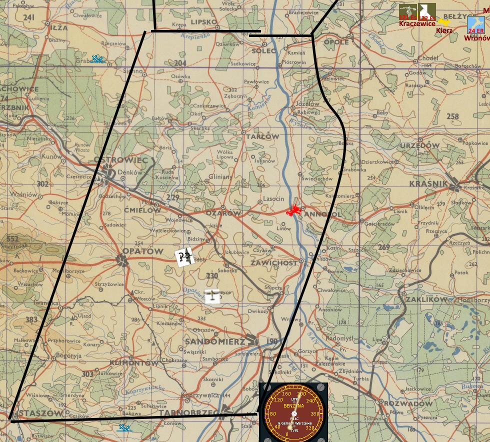Czyli:W zasadzie głębokość terenu nie stanowiła takiego problemu, jak jego długość... Front znajdował się w górze Wisły, więc im dalej lecieliby na południe, tym bliżej frontu by się znaleźli.. Z drugiej strony w razie nalotów na Dęblin, im dalej byliby na południe tym dalej byliby od zagrożenia... Ale jednocześnie przeprawy przez Wisłę były też na południu w ich sektorze.