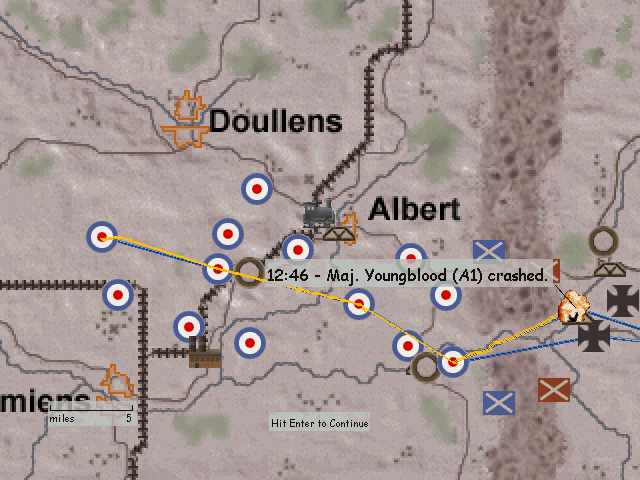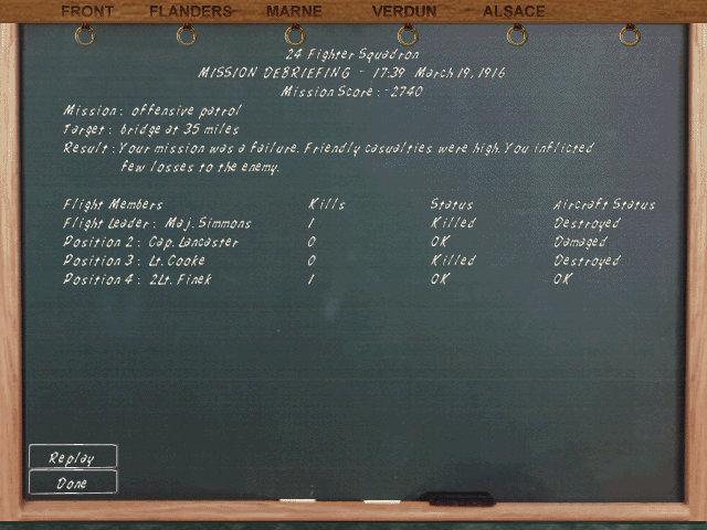 Porucznik walczył z francuzami przeciw bombowcom i przepadł za liniami wroga (moim zdaniem 1 mogli mu zaliczyć). Podporucznik Nedberry zginął, gdy KM z ziemi podpalił mu maszynę i musiał skakać. Tylko ja ocalałem...