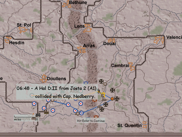 Drugi miał bliskie spotkanie ze skrzydłem innego Airco. Tak straciliśmy kapitana Nedberry. Walka jest tak ciasna, że wpadają na siebie samoloty... Strzelałem do jednego, a tu śmignął mnie przed KMem jeden z naszych. Wstrzymałem ogień o sekundę za późno...