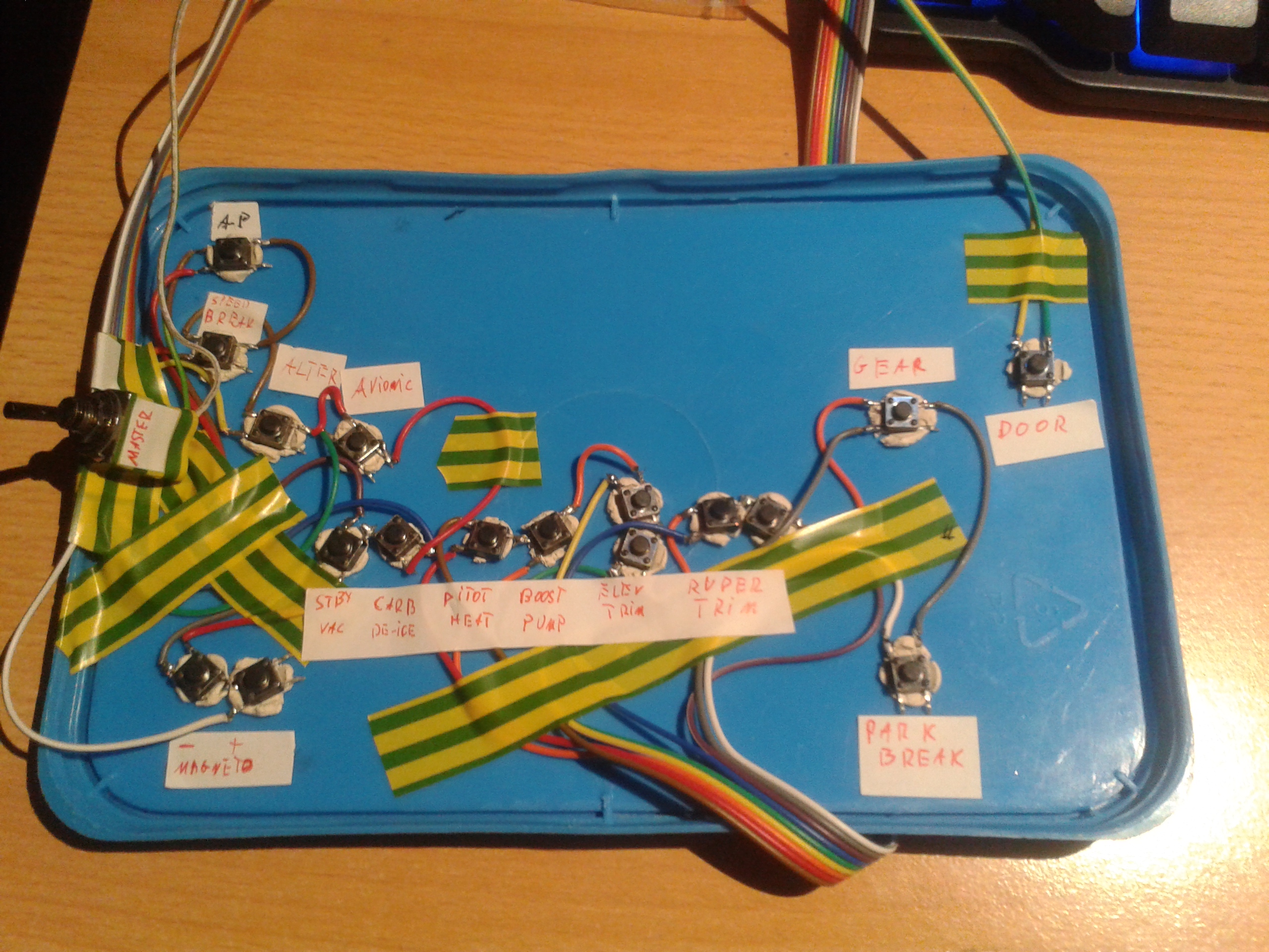 Potem zabrałem się za montowanie wszystkich elementów wejściowych kokpitu, czyli wszystkich przycisków, przełączników itp. To była masakra, okropna robota, dramat totalny, ale to zrobiłem. Nie przewidziałem tylko, że choćbym nie wiem jak się starał to te ogromne spaghetti kabli, które rosło z każdym jednym dodanym kneflem kiedyś się zemści. No ale robiłem dalej