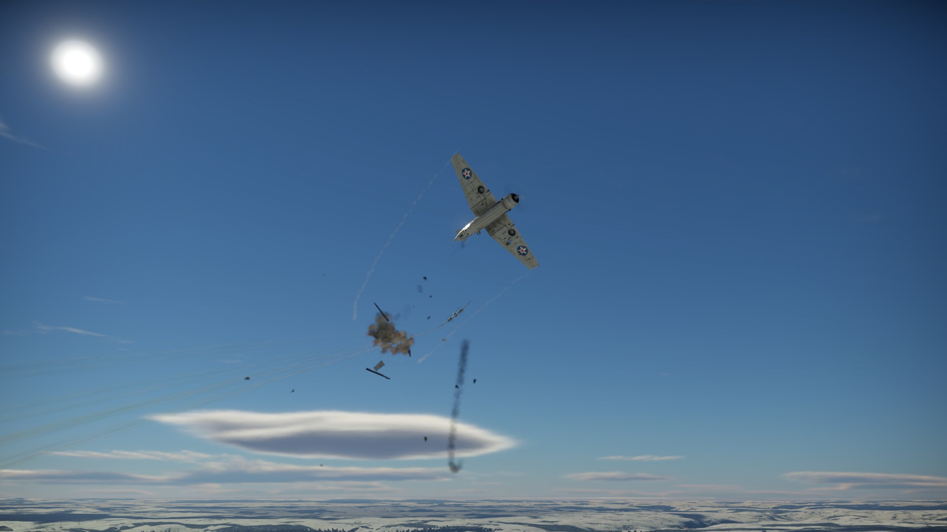 Zawróciliśmy i Pete otworzył ogień, a prawie natychmiast wrogi myśliwiec wypuścił dym... zielony. Albo trafiliśmy w zbiornik w kolorowym gazem, albo wrogi pilot chciał pokazać, że dla niego to będzie tylko zabawa.