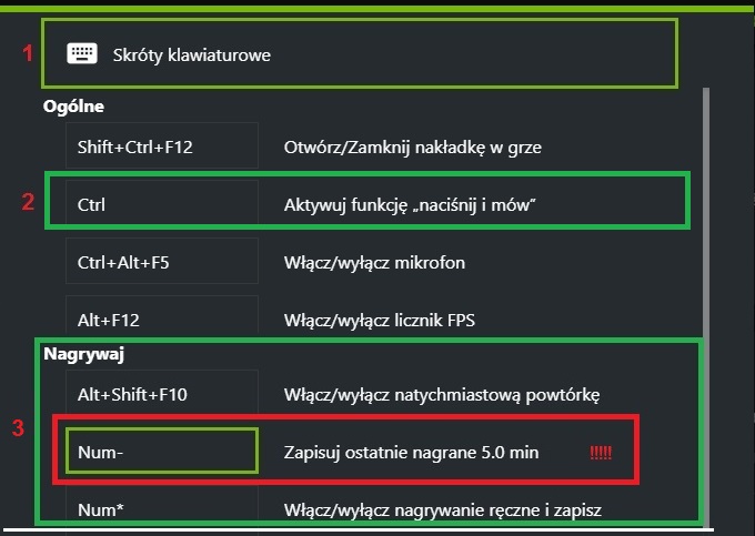 Na ekranie głównym "Ustawienia" widać kilkanaście opcji. Nas interesuje pięć: 1. Skróty klawiaturowe - należy przypisać "nieprzypisane" w grze przyciski klawiatury do odpowiednich funkcji. W moim przypadku dla funkcji "Natychmiastowa powtórka" jest przypisany klawisz Num-.