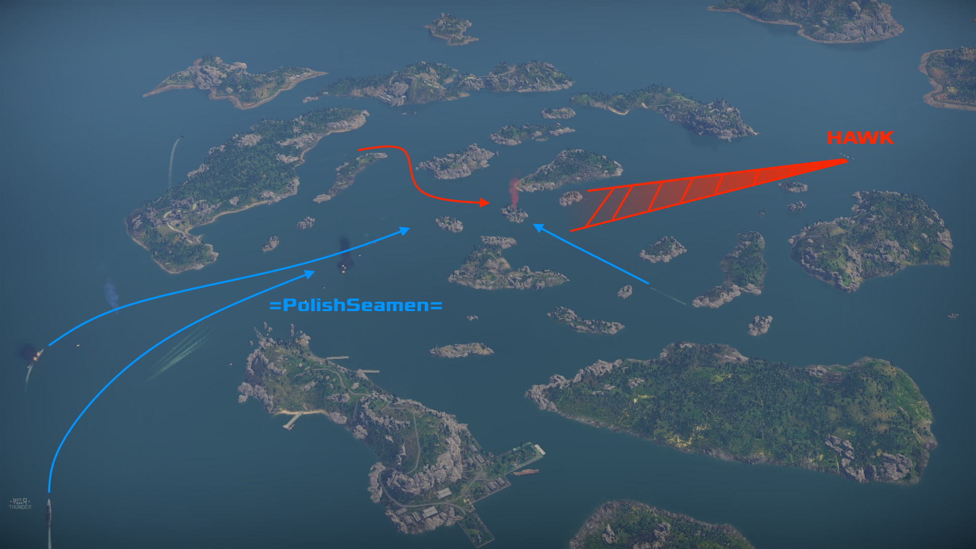 Hawki rozpoczęły grę 2 niszczycielami atakując punkt A, 2 kutrami oraz niszczycielem (punkt C).