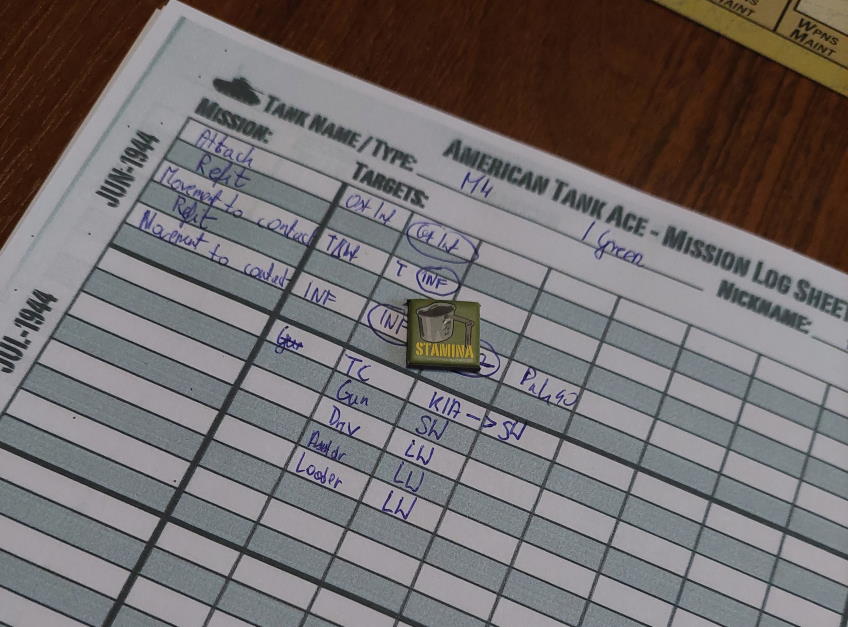 Czołg M4 #35-348 "Zielony" pozostał na polu bitwy. (umiejętność jednorazowa "Stamina" pozwala zamienić wynik KIA->Ciężko ranny)