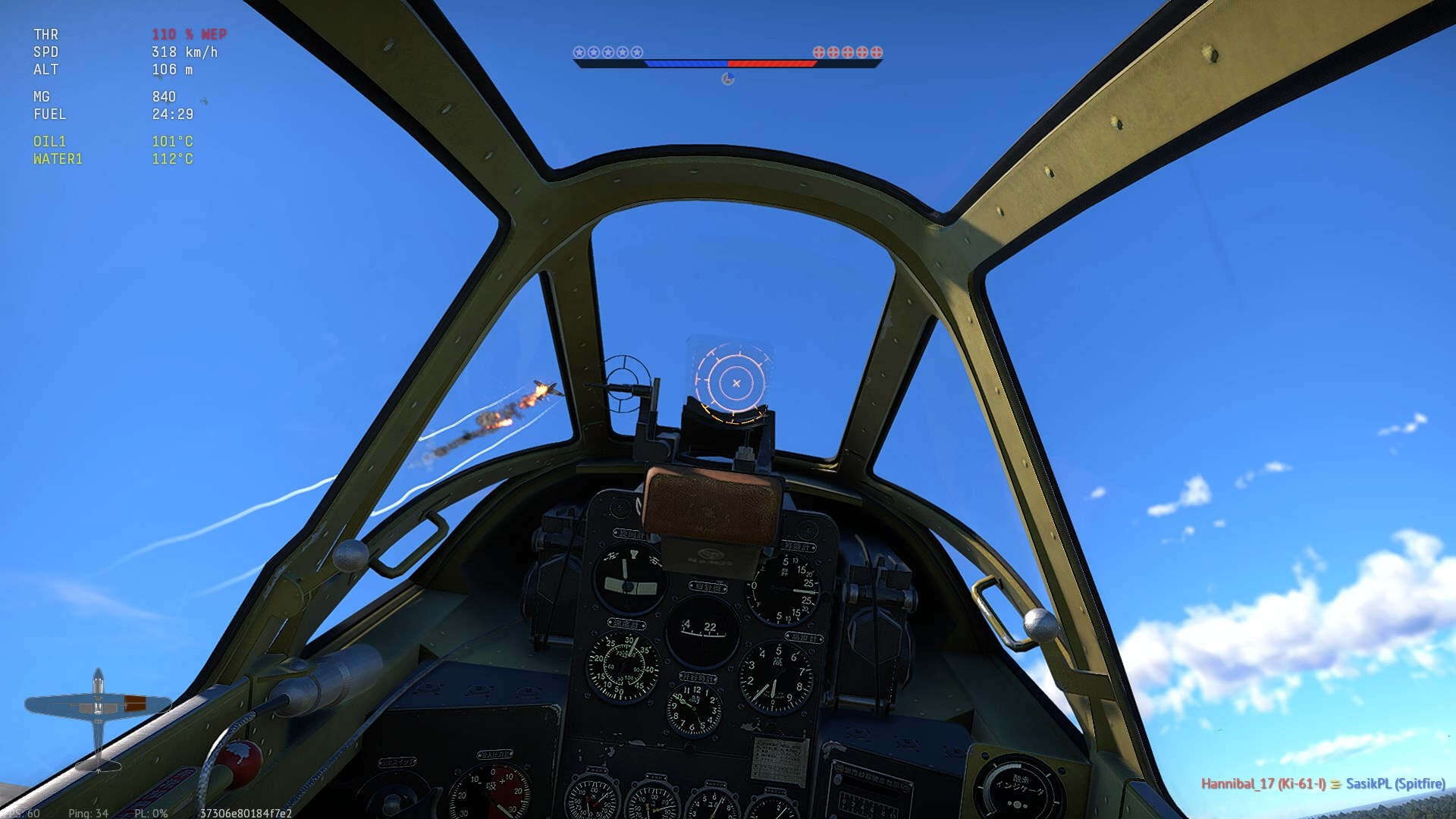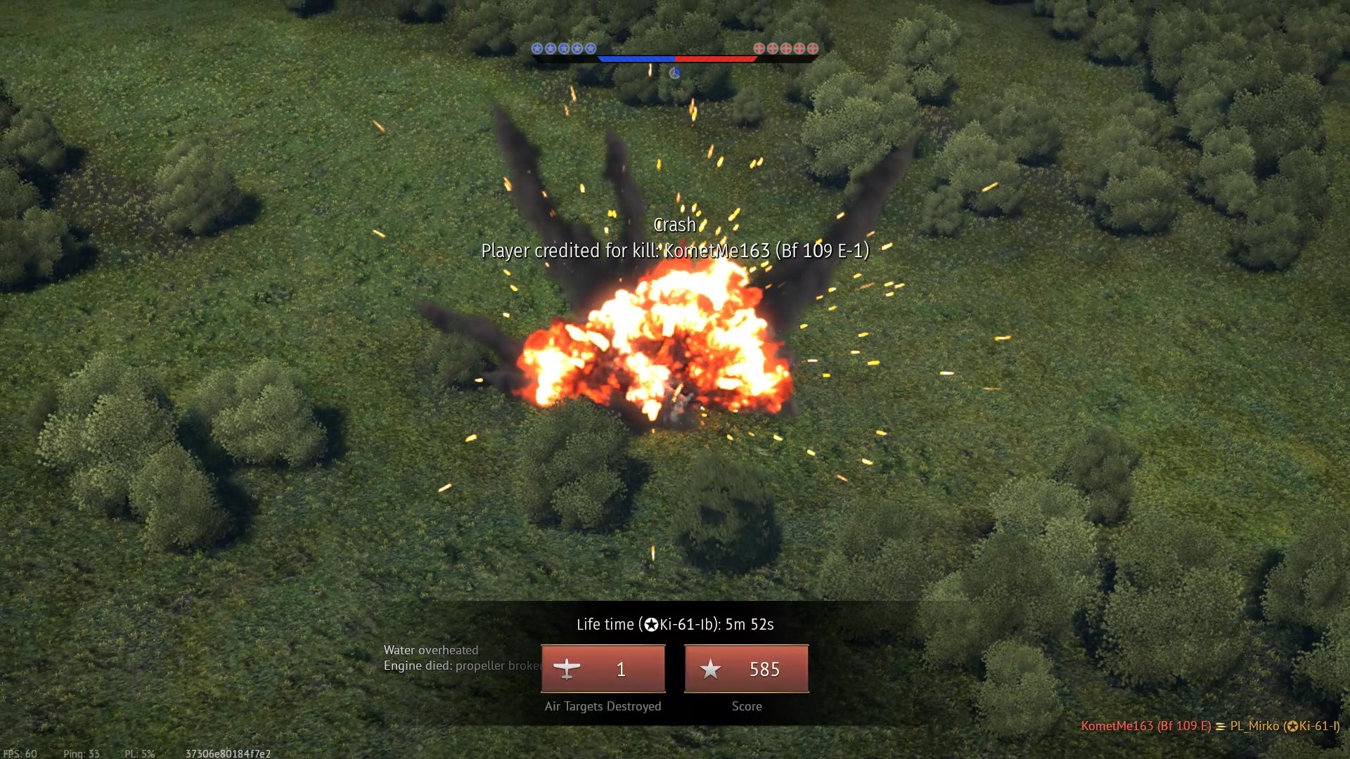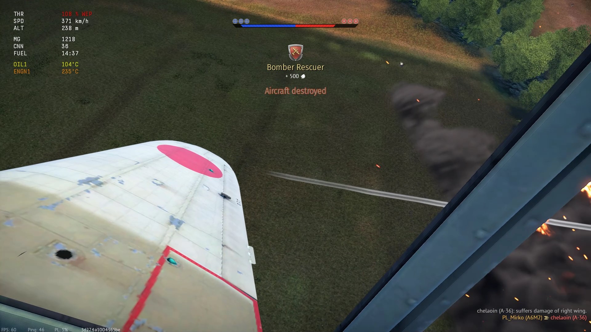 Został trafiony przeze mnie prawdopodobnie w "zadek" z "cienkich". Napis "Hit", (3:07), rozbłysk na stateczniku pionowym i dwa obłoczki dymu.