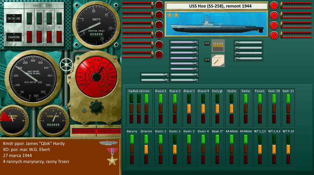 Wraz ze światłem zaczęły napływać meldunki. Przecieki cały czas były utrzymywane pod kontrolą i pomimo ociężałości okrętu, XO wciąż miał możliwość utrzymania okrętu w stabilności. Ze sterami i silnikami sytuacja tymczasem pozostawała bez zmian... Trzy motory elektryczne cały czas były sprawne, baterie też nie uległy zwarciu, a dziobowy ster wciąż był zacięty, ale z tym XO powoli uczył się radzić, jakby ster wcale się nie zaciął... A wróg cały czas był w pobliżu...