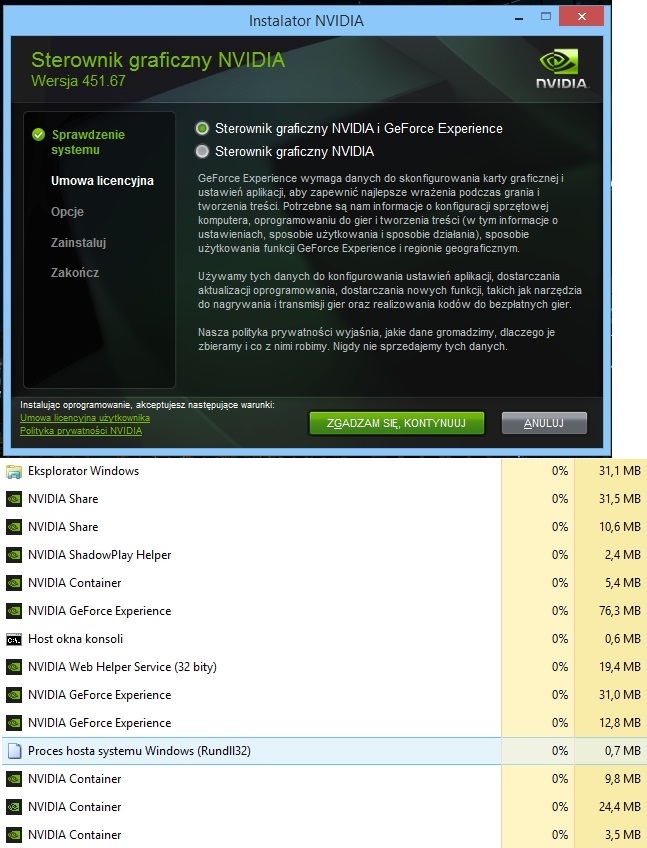 Jeżeli nie korzystasz z GF Experience zalecam zaznaczenie pola 2 "Sterownik graficzny NVIDIA" - instalacja tylko sterownika. Po instalacji GF Experience w pamięci rezyduje wiele modułów NV w tym interesujący nas "NVIDIA ShadowPlay helper". II. Pierwsze uruchomienie.