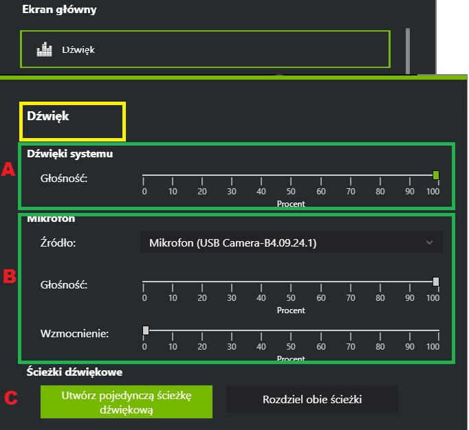 - lub zdecydować - C, czy GF Experience ma połączyć nagrywane ścieżki, czy może ma rozdzielić, tak aby przy montażu filmu można było edytować każdą ścieżke oddzielnie (np. zmienić głośność) lub ewentualnie usunąć ścieżkę z filmu.