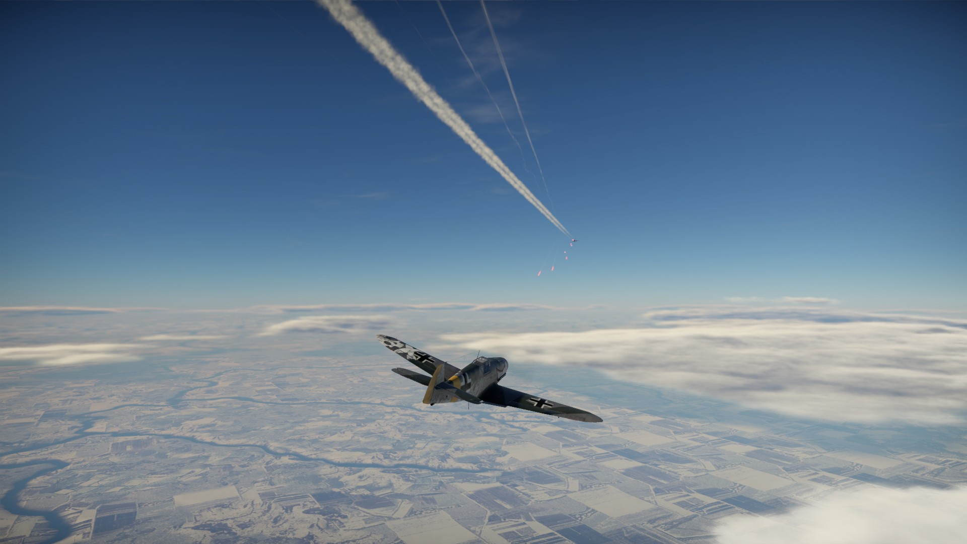 Szczęśliwie jeden z myśliwców odpuścił. Pewnie jego zadaniem było pilnować baz i skoro zrzuciłem ładunek, rozejrzał się za innym celem.