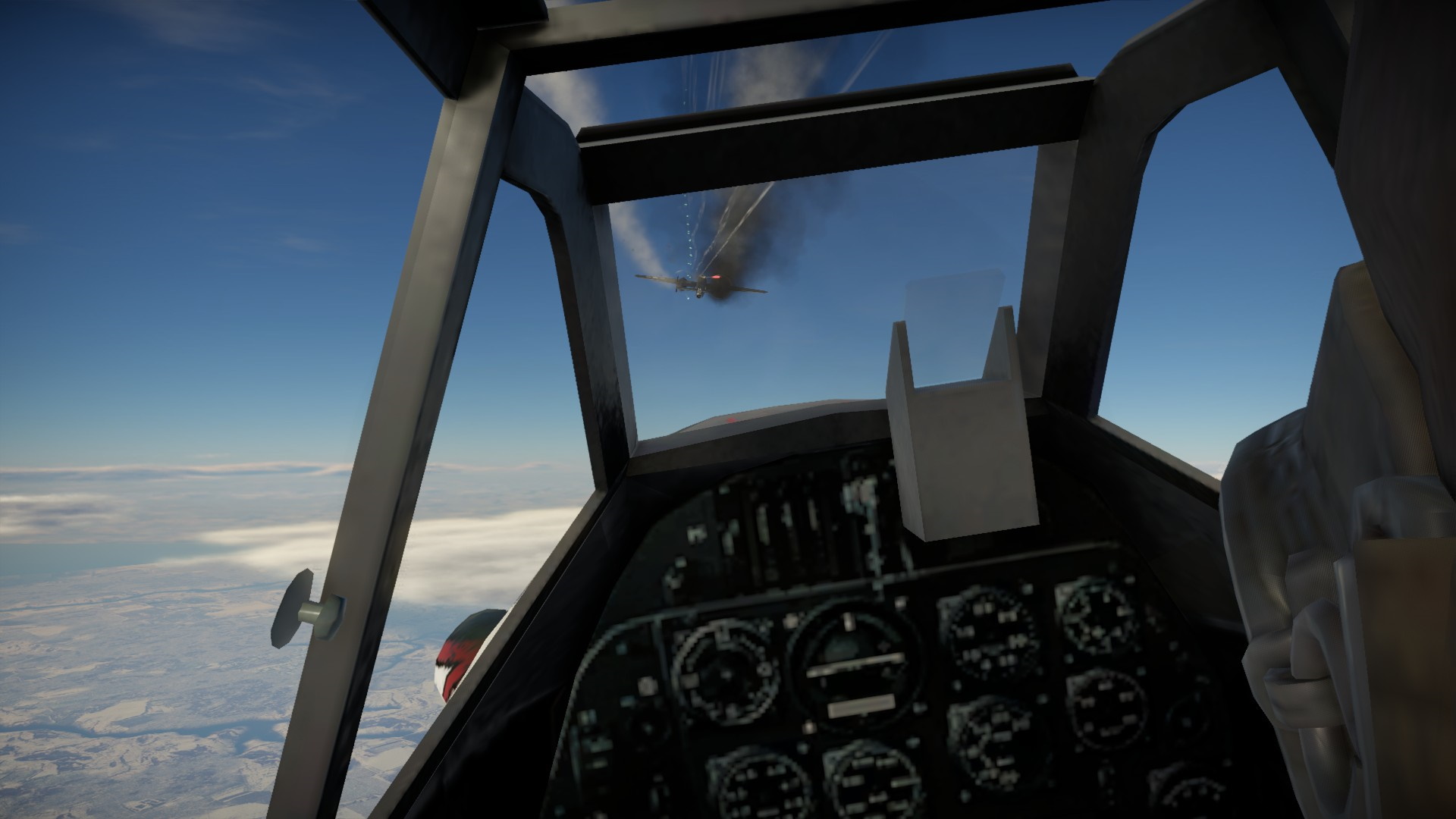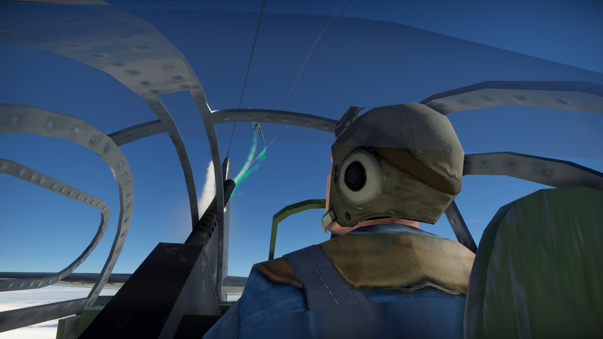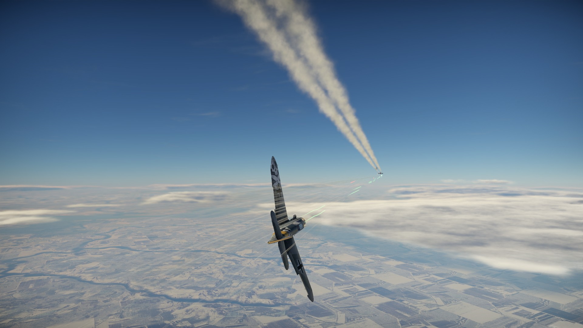 Zawróciliśmy i Pete otworzył ogień, a prawie natychmiast wrogi myśliwiec wypuścił dym... zielony. Albo trafiliśmy w zbiornik w kolorowym gazem, albo wrogi pilot chciał pokazać, że dla niego to będzie tylko zabawa.