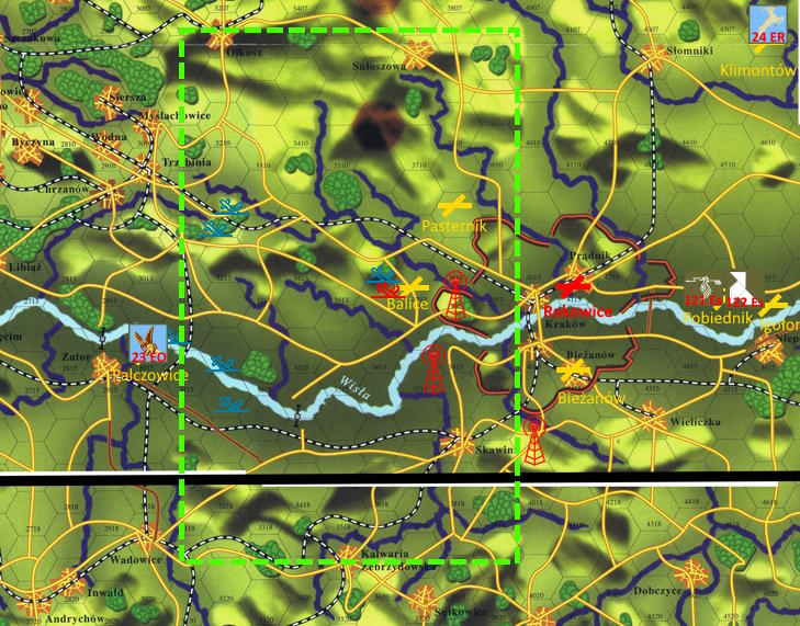 -Chorąży Baran. Wraz ze skrzydłowym polecicie nad Kraków, gdy tylko wrócą wysłane klucze. Planujemy start na 11:00. Samoloty 122 eskadry będą wracać na lotnisko po 11:00 i o 12:00 już para powinna być gotowa i kolejna ze 121-szej. W razie wykrycia małego zgrupowania nieprzyjaciela, możecie atakować sami, w razie dużego zgrupowania, meldować, dostaniecie nowe rozkazy. Parą nie rzucajcie się na silnego wroga. Oczywiście jak okaże się, że to duża, rozproszona formacja, to atakujcie maruderów... Będzie operować na zachód od Krakowa, od mniej więcej Olkusza, aż po Wadowice na południu. Pod Krakowem są trzy radiostacje. Są pod Bielanami, Tyńcem i Ochojno. Jak wykryją nieprzyjaciela, też będą o tym meldować, więc mogą was naprowadzić na pojedynczych intruzów, jak teraz Stanisława. Czy macie jakieś pytania do zadania.