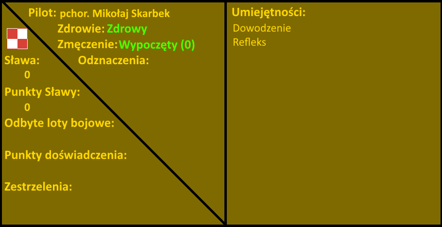 ppor. Mikołaj "Święty" Skarbek (NPC) - Zdrowy, zmęczenie 0 (wypoczęty) - EXP 5/4 [w tym 1/3], uszkodzenie Me110, zestrzelenie: 2,5 He111, 2x1/2 Ju87, 1 Bf109 (prawdopodobne)