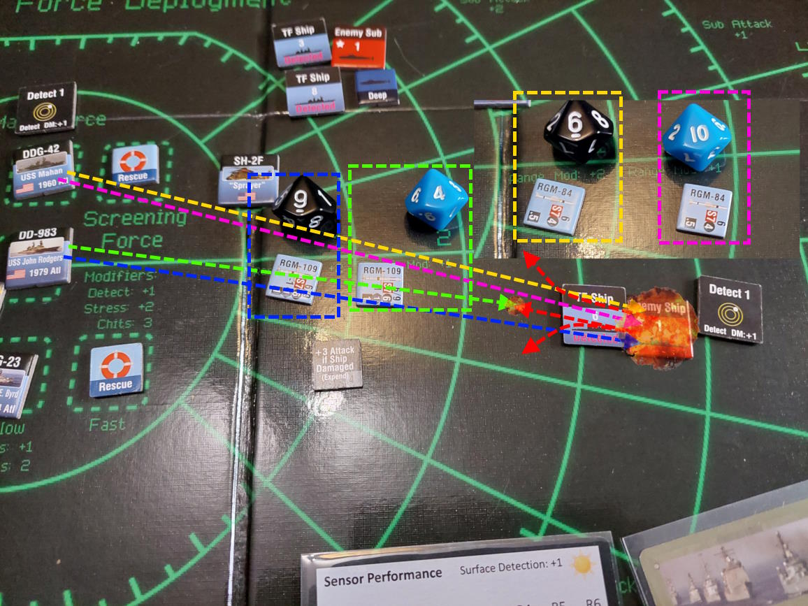 Nasz Sea King znalazł się w kłopotach, gdy sowieci otworzyli do niego ogień. Jedna z rakiet trafiła w pobliże i eksplodowała, powodując utratę panowania nad maszyną, co wystawiało go na kolejne ataki. Na szczęście atak Harpoonami przeprowadzony przez USS Mahan okazał się skuteczny i odciągnął uwagę wroga od uszkodzonego helikoptera..