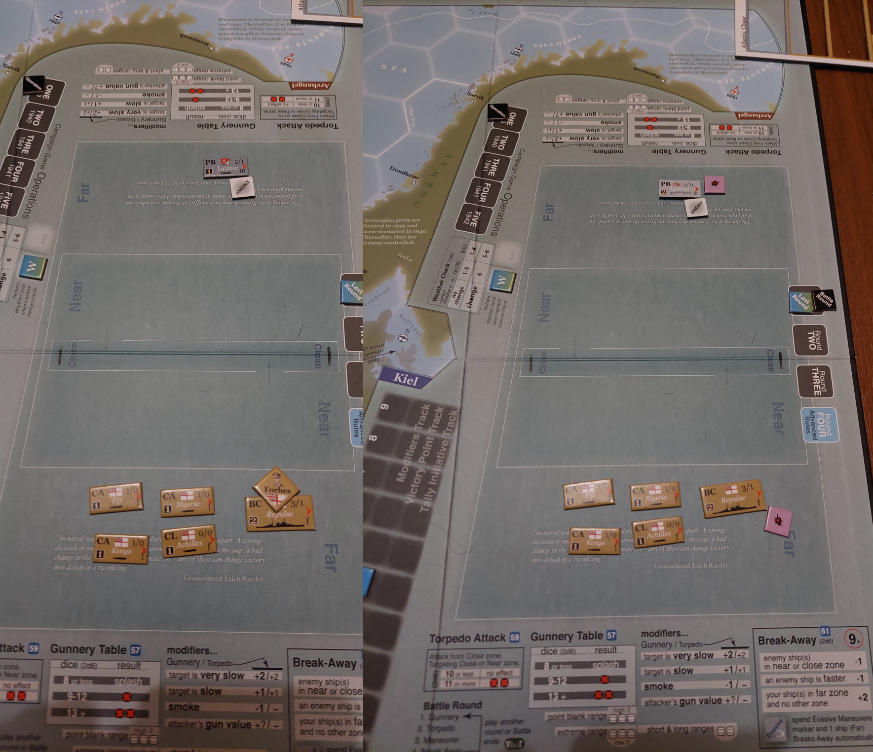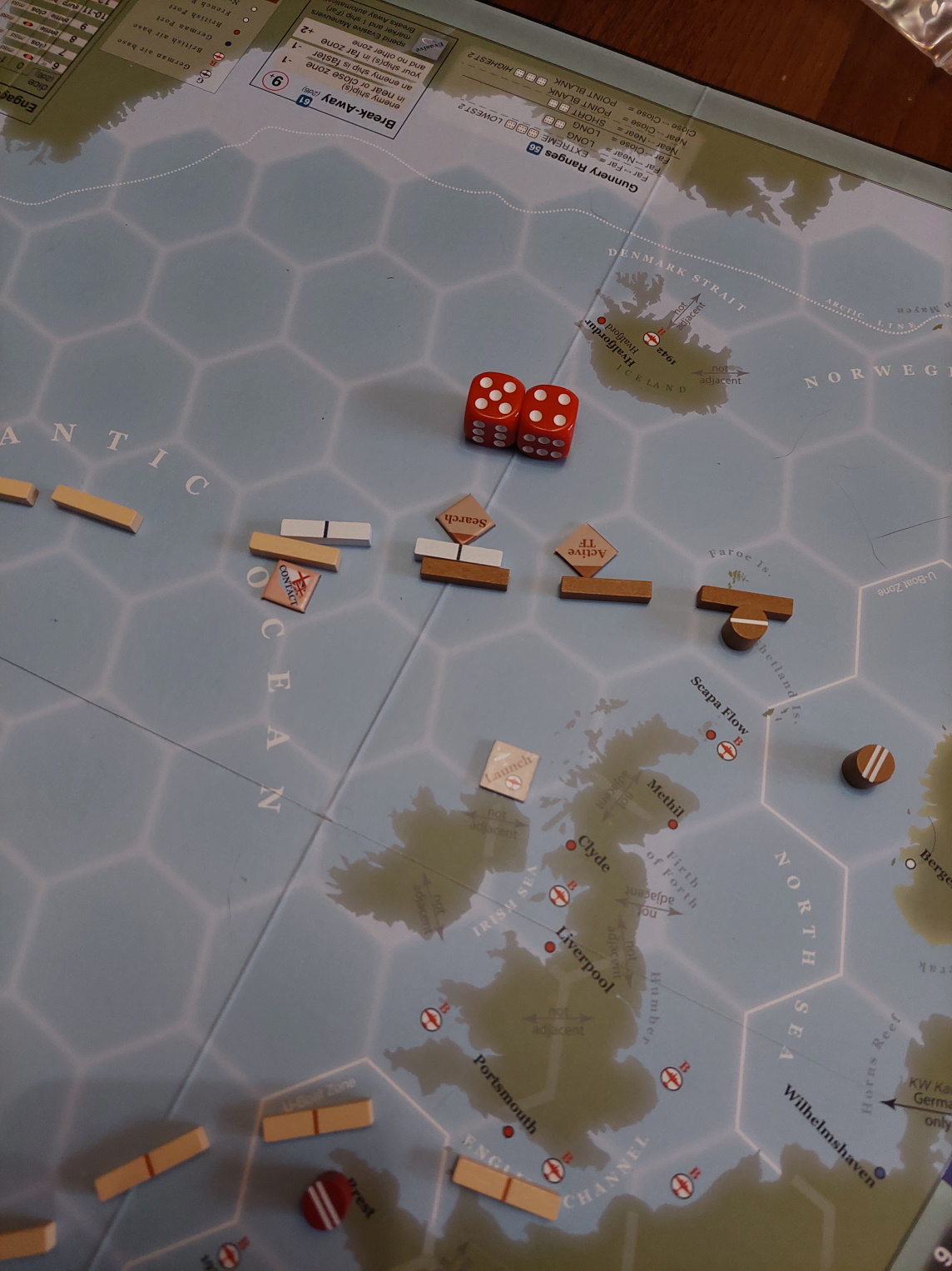 2 Eskadra Bojowa odnalazła okręty na Norweskich wodach. Okazało się, że to nie szukany pancernik, a Norweski patrol. Są mocno niezadowoleni z obecności naszych okrętów na ich wodach (a o Niemcach nie mieli). Ruszamy nasz zespół pomiędzy Wielką Brytanię i Islandię.