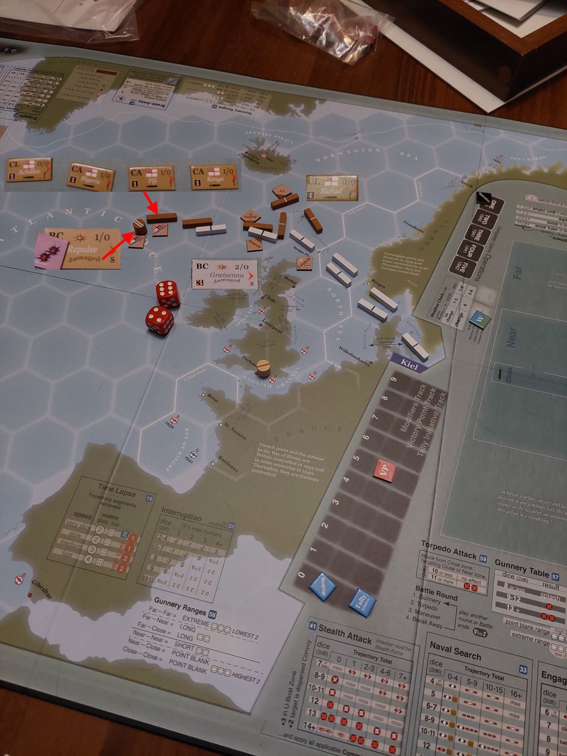 Gdzieś na Atlantyku są Niemcy, jak również w Niemczech... Statki Niemców będą przebijać się do domu, okręty próbować wyjść w morze. Największy problem sprawia Norwegia. Będą chcieli na pewno tamtędy przebijać się na Atlantyk i z powrotem. Pod Norwegię wysyłamy zespół z lekkim krążownikiem Naiad*, ja wyprowadzam 1 Eskadrę Bojową (krążownik liniowy Repulse i grupę krążowników) na patrol na Atlantyku.