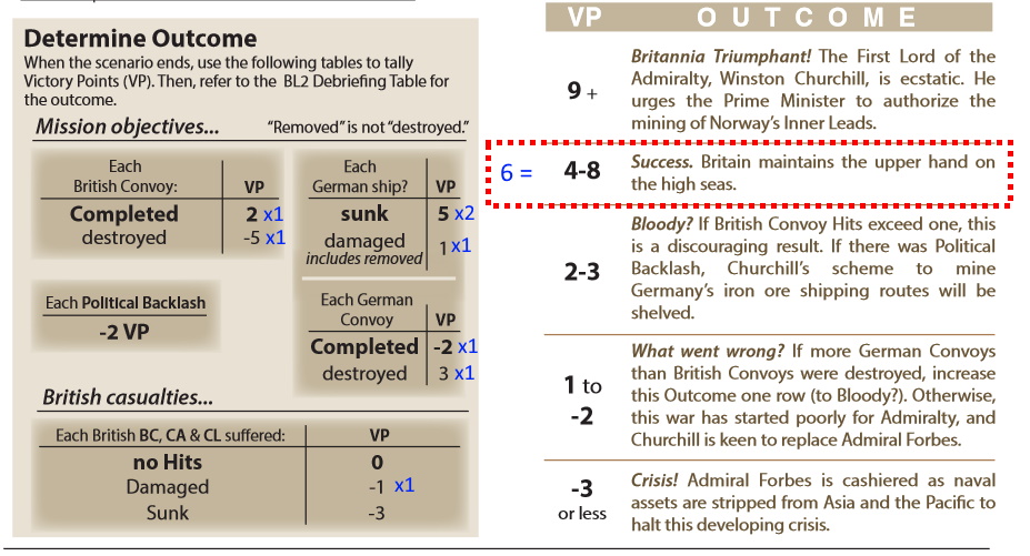 Podsumowujemy ostatni miesiąc. Wróg utracił wiele zarekwirowanego towaru w neutralnych statkach, zatopiono jednego łamacza blokad, jeden uzbrojony frachtowiec oraz 1 krążownik liniowy. Uszkodzono kolejny okręt liniowy i pancernik kieszonkowy. Możliwe, że podczas sztormu łamacz blokad przebił się do Niemiec. Pomimo tego, że jednemu z rajderów udało się zaatakować konwój Pierwszy Lord Morski, Admirał Floty Alfred Dudley Pickman Rogers Pound powinien być zadowolony z uzyskanych wyników. Siły Kriegsmarine zostały osłabione i nie będą mieć takiej możliwości zakłócania naszych szlaków handlowych, jak mieli na początku wojny.