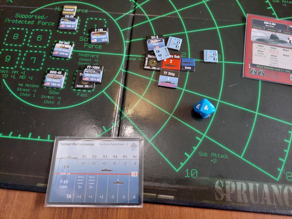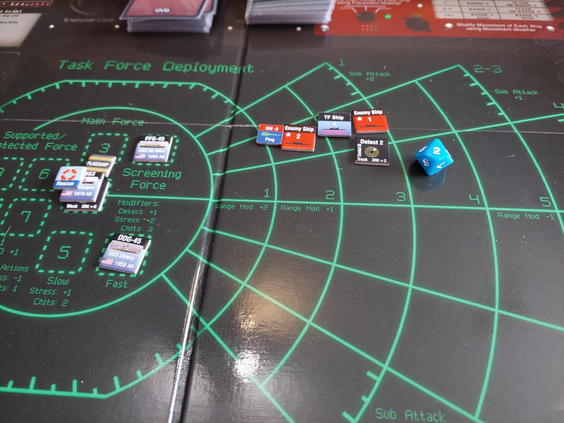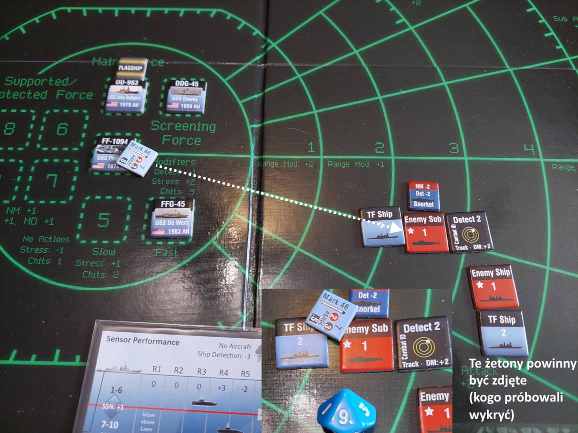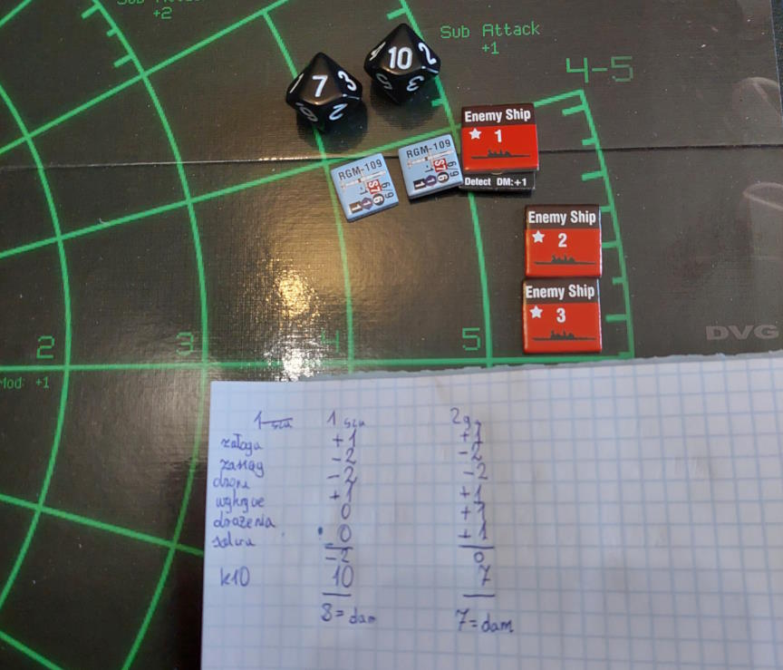 ... gdy nawiązano kontakt z wrogim zespołem. Akcje szybkie dowódcy: 1 - zbliżenie, rzut na chorobę udany, akcje okrętów szybkie (osłona) - rozpoznanie celu -> Uzyskano kontakt z nierozpoznaną jednostką [pogoda uniemożliwia osiągnięcie pełnej identyfikacji kontaktu. Przy 1k10 kara za pogodę wynosi 3, a rozpoznanie wymagałoby wyniku 9, przy najlepszej załodze mogącej dodać +1 do rzutu