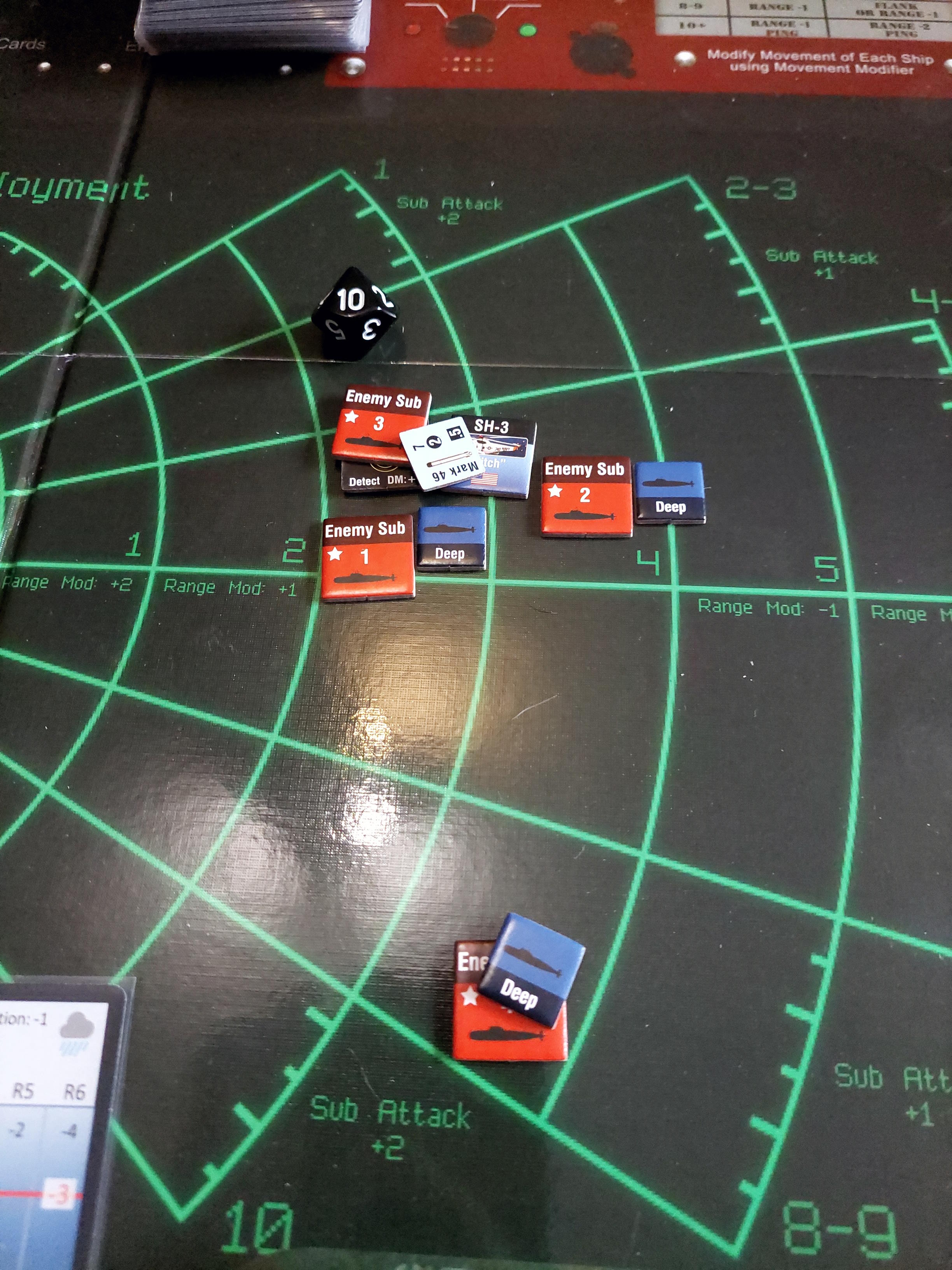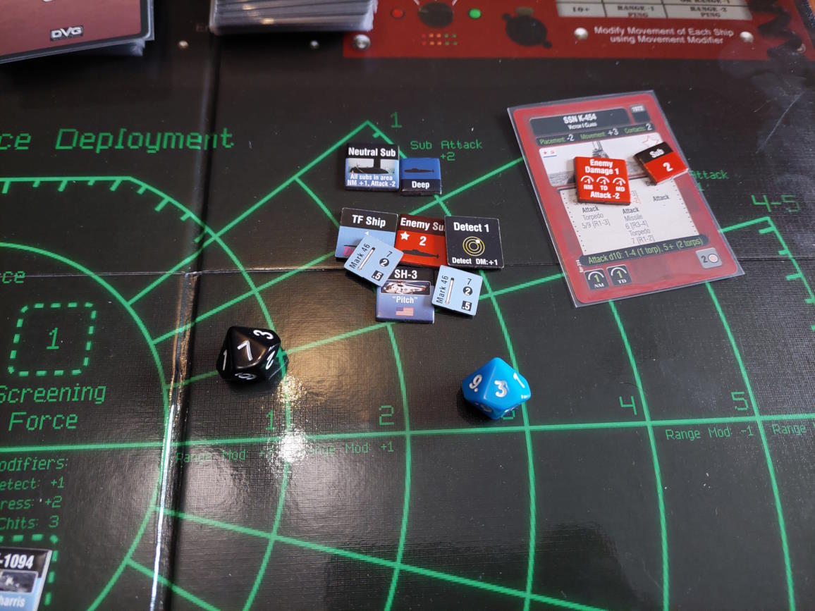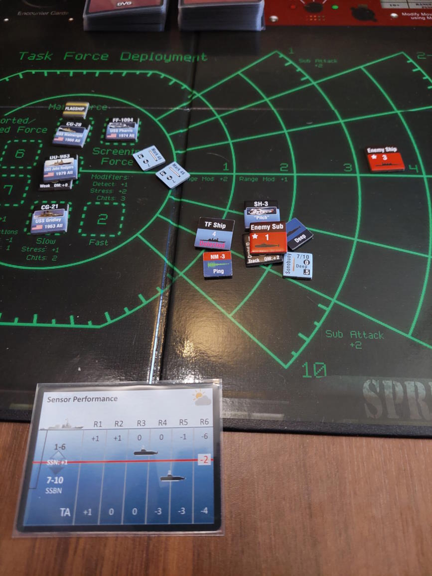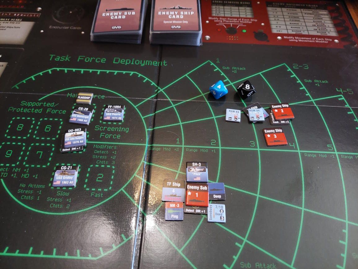 ... gdy nawiązano kontakt z wrogim zespołem. Akcje szybkie dowódcy: 1 - zbliżenie, rzut na chorobę udany, akcje okrętów szybkie (osłona) - rozpoznanie celu -> Uzyskano kontakt z nierozpoznaną jednostką [pogoda uniemożliwia osiągnięcie pełnej identyfikacji kontaktu. Przy 1k10 kara za pogodę wynosi 3, a rozpoznanie wymagałoby wyniku 9, przy najlepszej załodze mogącej dodać +1 do rzutu