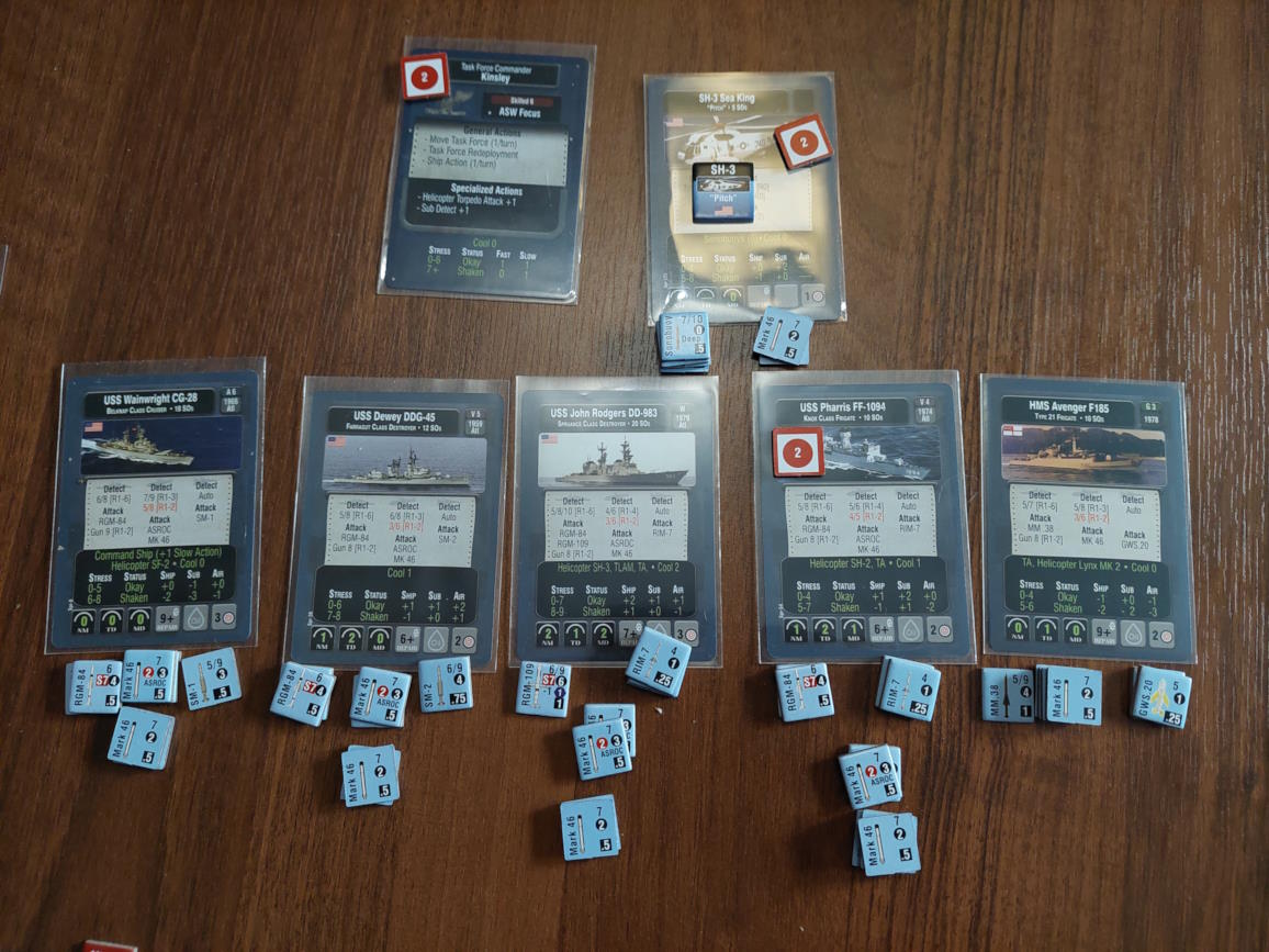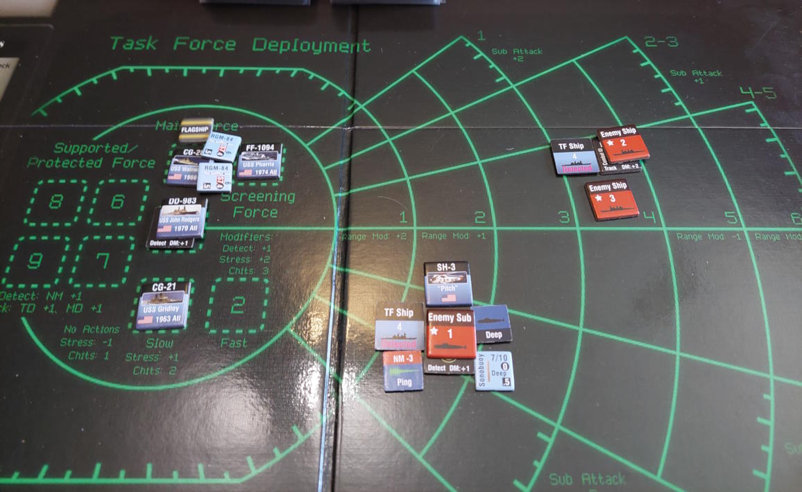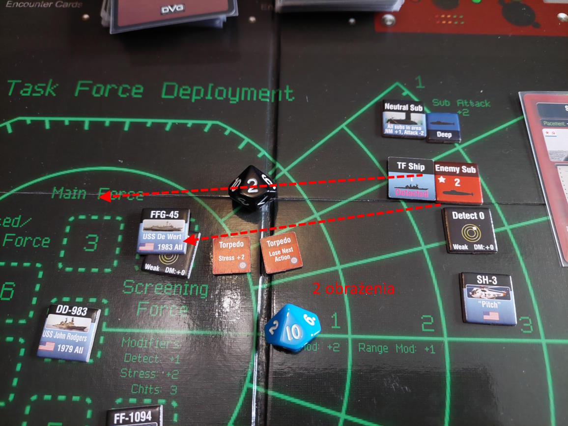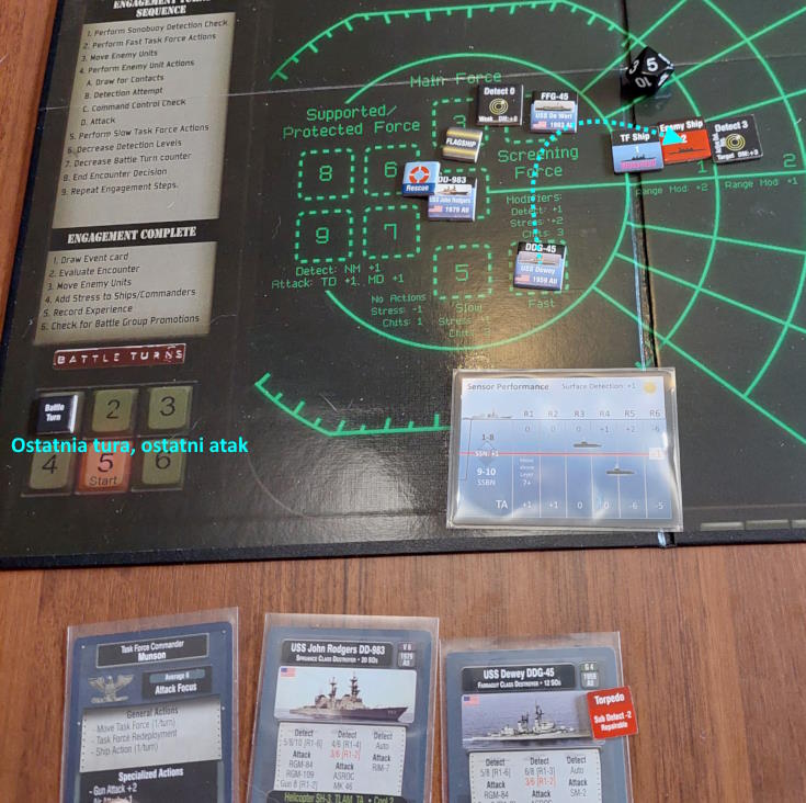 O 16:43 mój okręt flagowy stał się celem ataku. Ostatni Rosyjski okręt, rozpoznany potem jako Severomorsk przeprowadził atak na USS Wainwright, CG-28, uzyskując dwa trafienia. Uszkodzony został system kierowania ogniem, a druga z rakiet SS-N-14 Silex (prawdopodobnie) trafiła okręt w pobliżu wyrzutni rakietorped. To już nie były stateczki, teraz naszym przeciwnikiem byli prawdziwi sowieccy marynarze... Literówka na żetonie. Mój okręt otrzymał -2 do pociągania