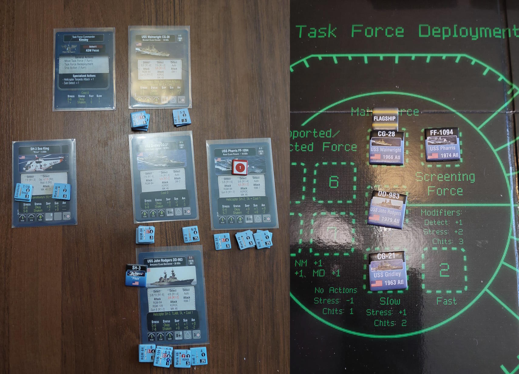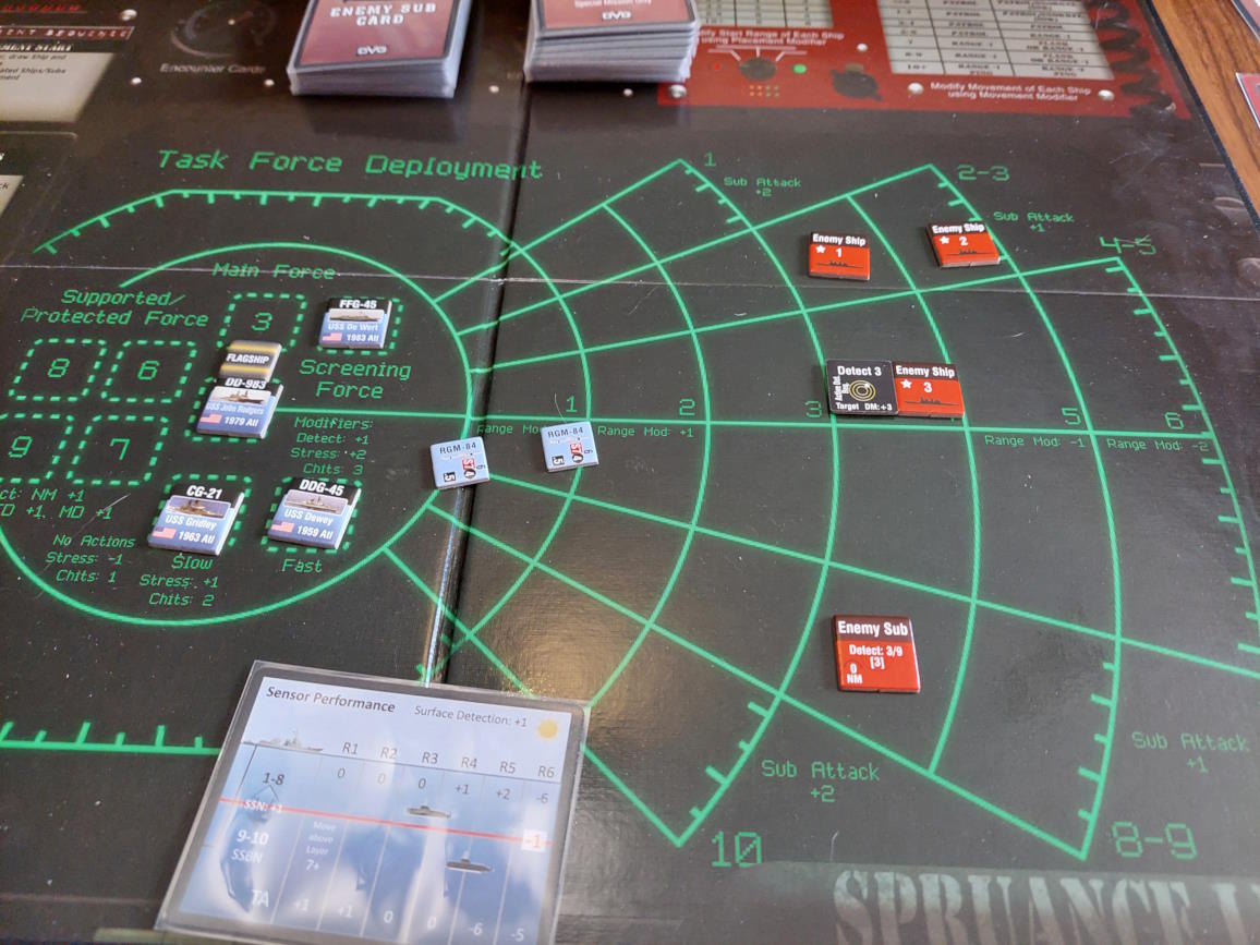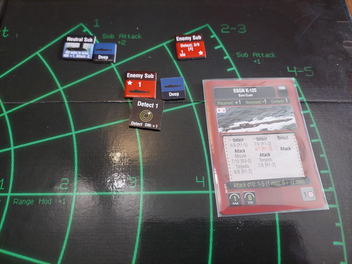 O 16:43 mój okręt flagowy stał się celem ataku. Ostatni Rosyjski okręt, rozpoznany potem jako Severomorsk przeprowadził atak na USS Wainwright, CG-28, uzyskując dwa trafienia. Uszkodzony został system kierowania ogniem, a druga z rakiet SS-N-14 Silex (prawdopodobnie) trafiła okręt w pobliżu wyrzutni rakietorped. To już nie były stateczki, teraz naszym przeciwnikiem byli prawdziwi sowieccy marynarze... Literówka na żetonie. Mój okręt otrzymał -2 do pociągania