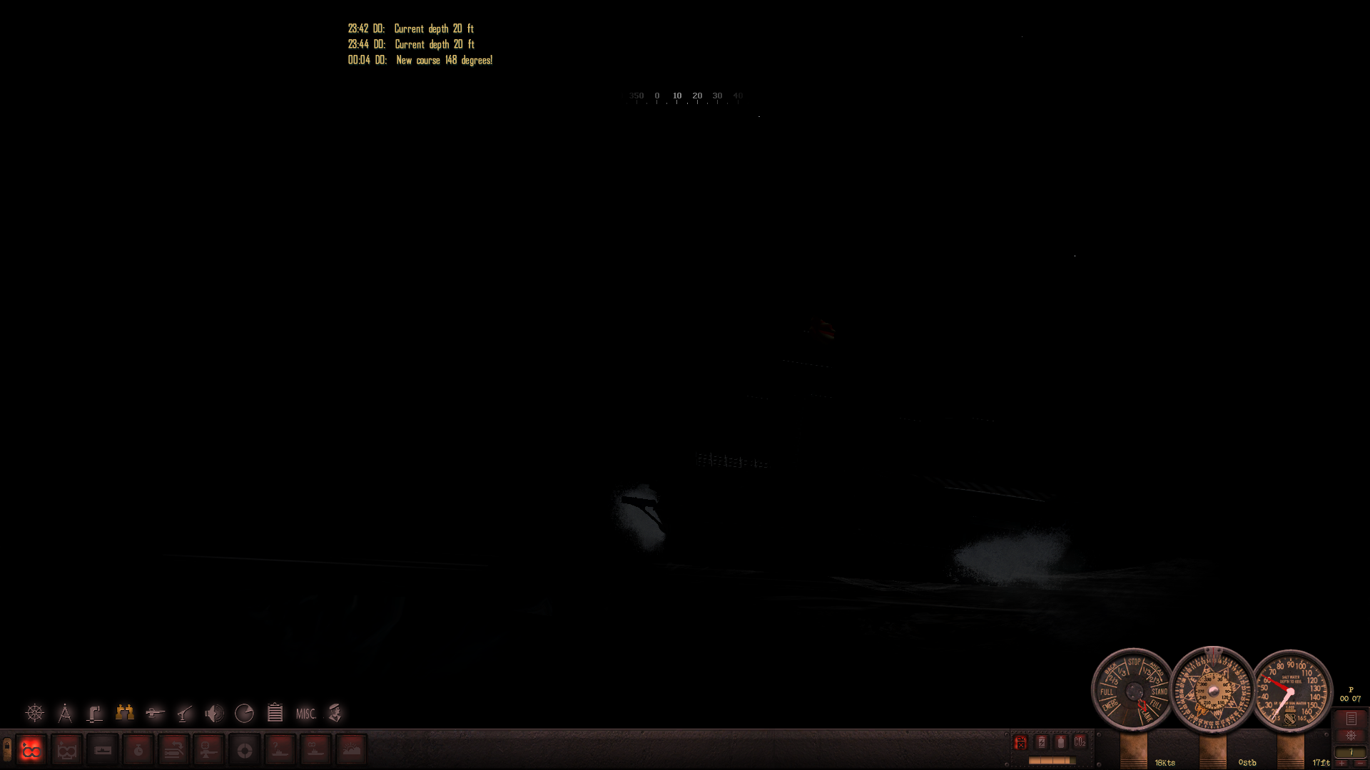 Odległość jakieś 2000 jardów do celu. Podnoszę okręt na 50 stóp - zanim wydam rozkaz "mała naprzód" aby zająć dogodną pozycję do dobicia celu rozglądam się jeszcze "na wszelki wypadek" po powierzchni.